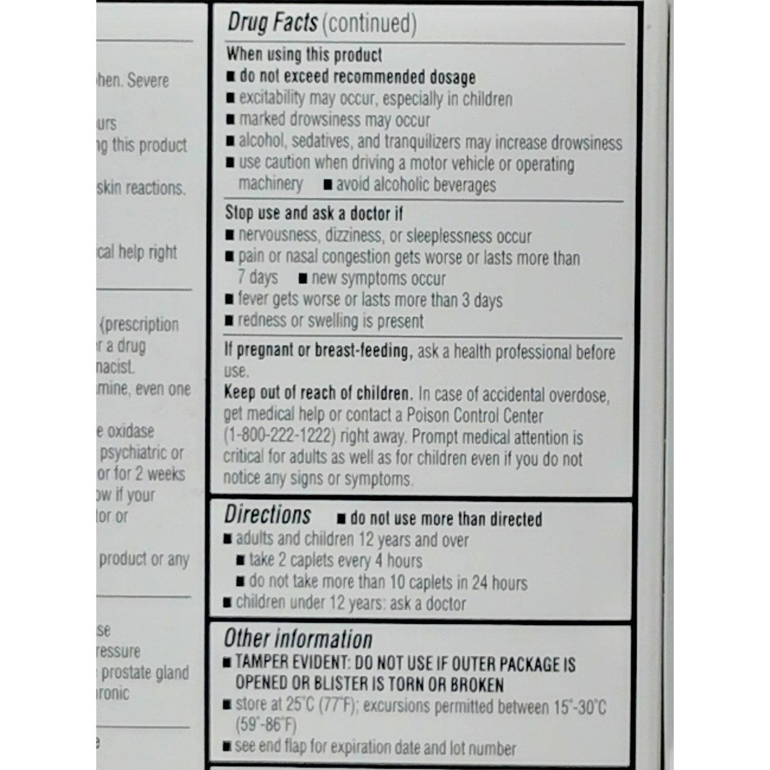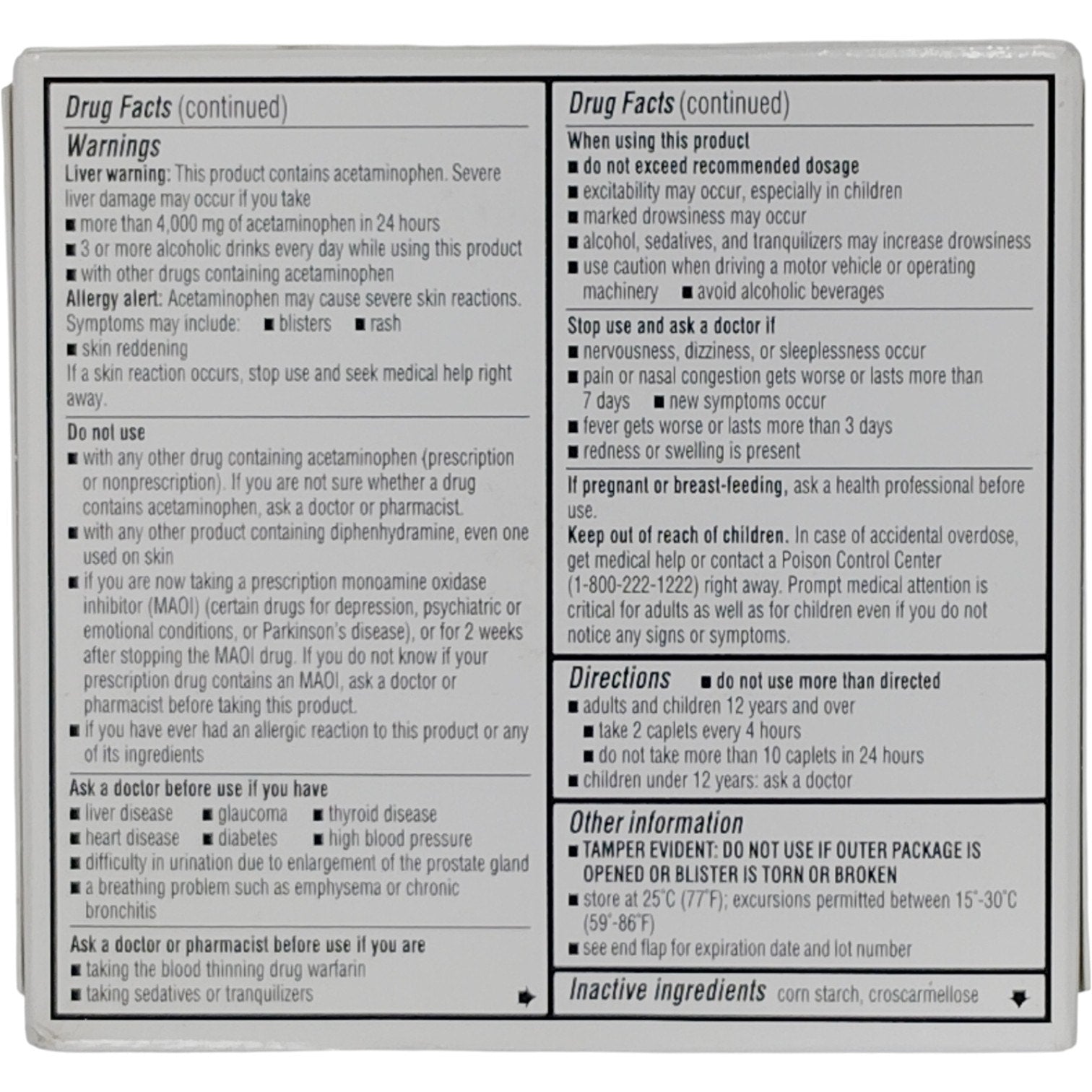 DG Health Allergy Plus Sinus Headache Relief caplets formulated to relieve sinus pressure, nasal congestion, headache, and allergy symptoms. Each caplet contains 325mg acetaminophen, 12.5mg diphenhydramine HCl, and 5mg phenylephrine HCl. Non-drowsy daytime formula. Pack includes 24 coated caplets. Expiration date: 04/30/2027.