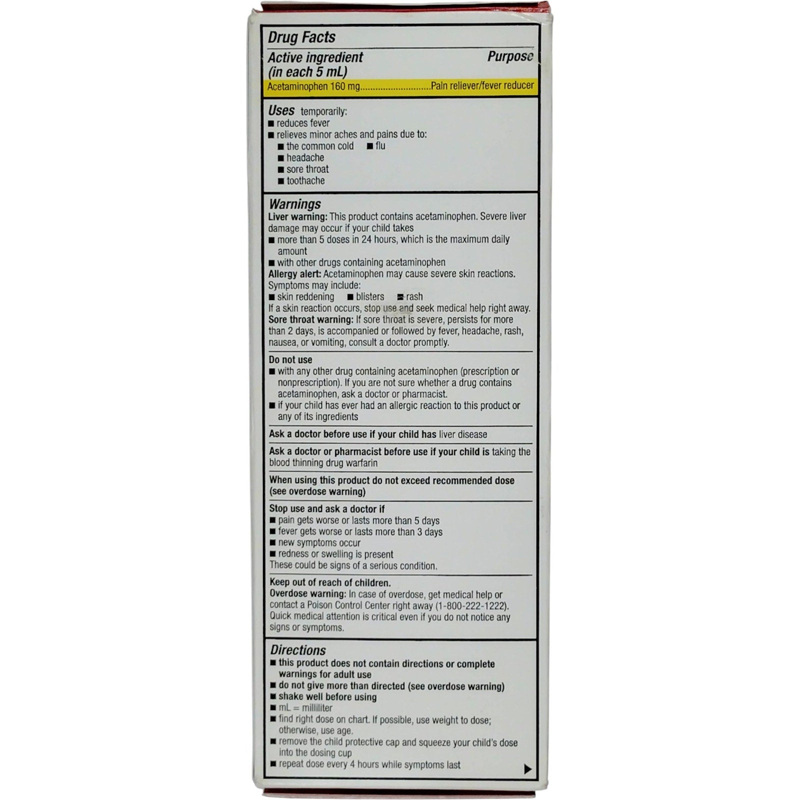 - Active ingredient: Acetaminophen 160mg per 5mL