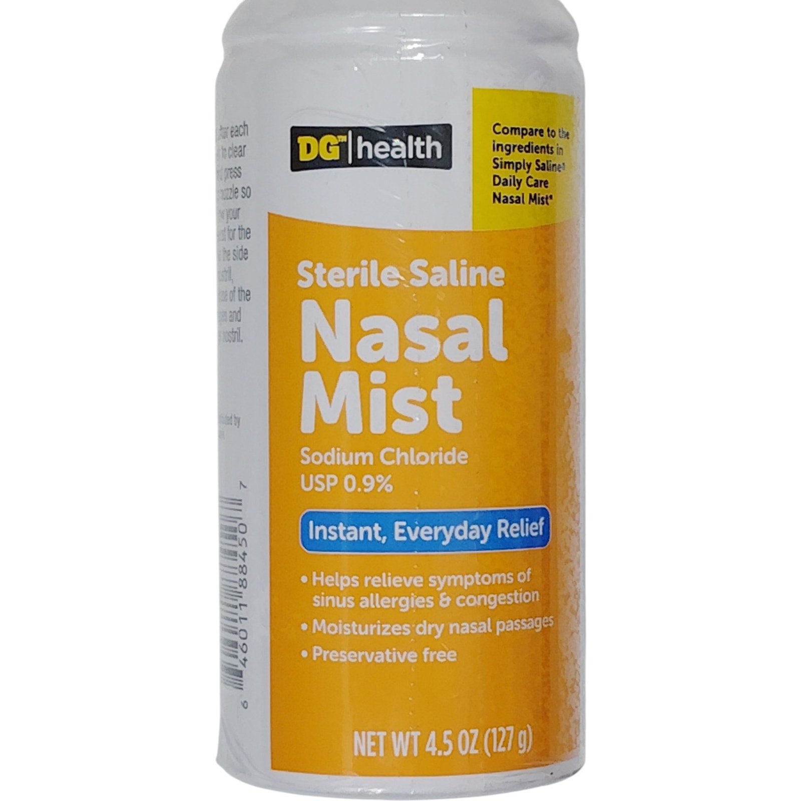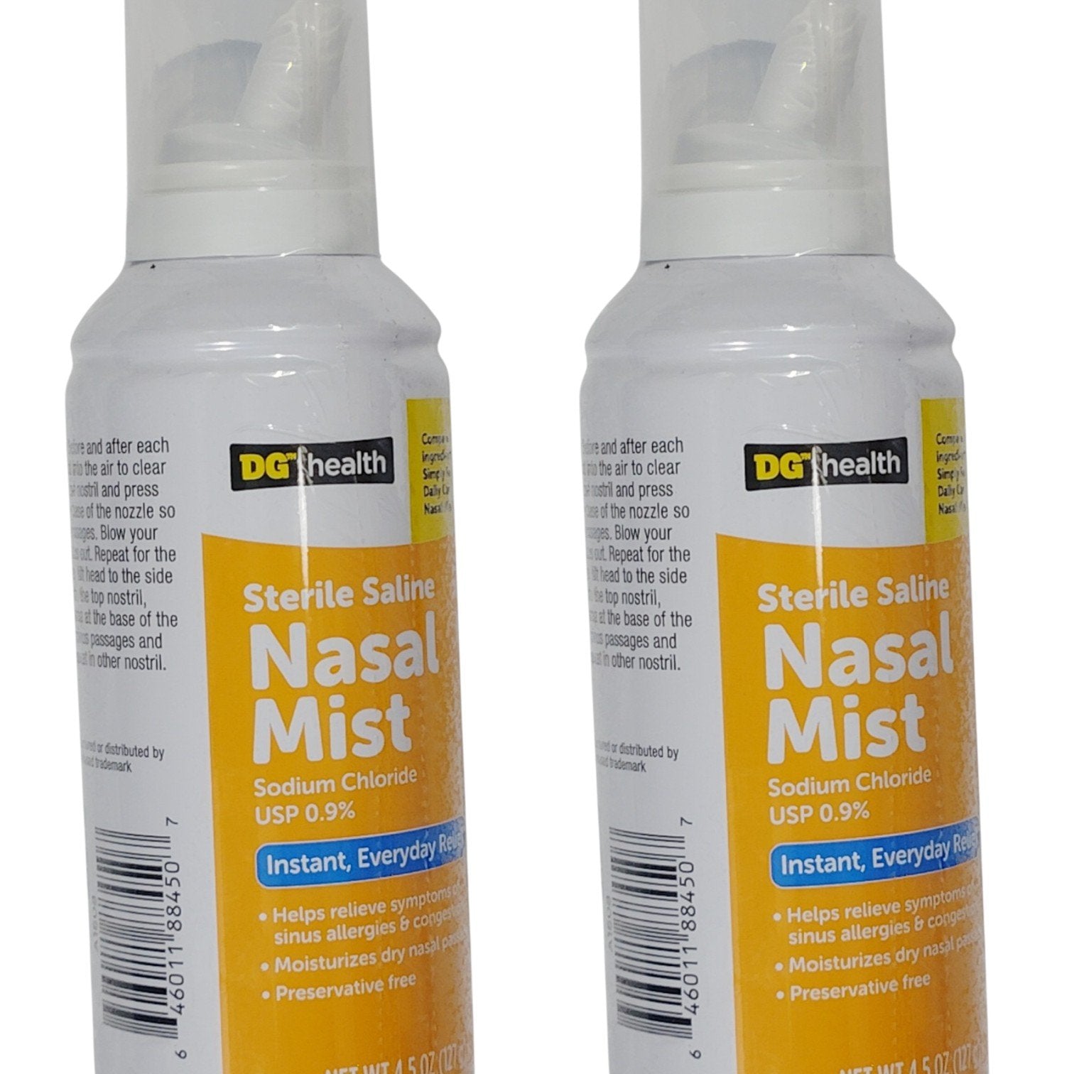 DG Health Nasal Mist is a non-medicated saline spray that helps relieve nasal dryness and congestion due to colds, allergies, or dry air. Gentle enough for daily use, this 2-pack includes two 4.5 oz bottles, each designed to moisturize nasal passages and support easier breathing. Suitable for adults and children. Expiration date: 02/28/2027. UPC: 646011884507.