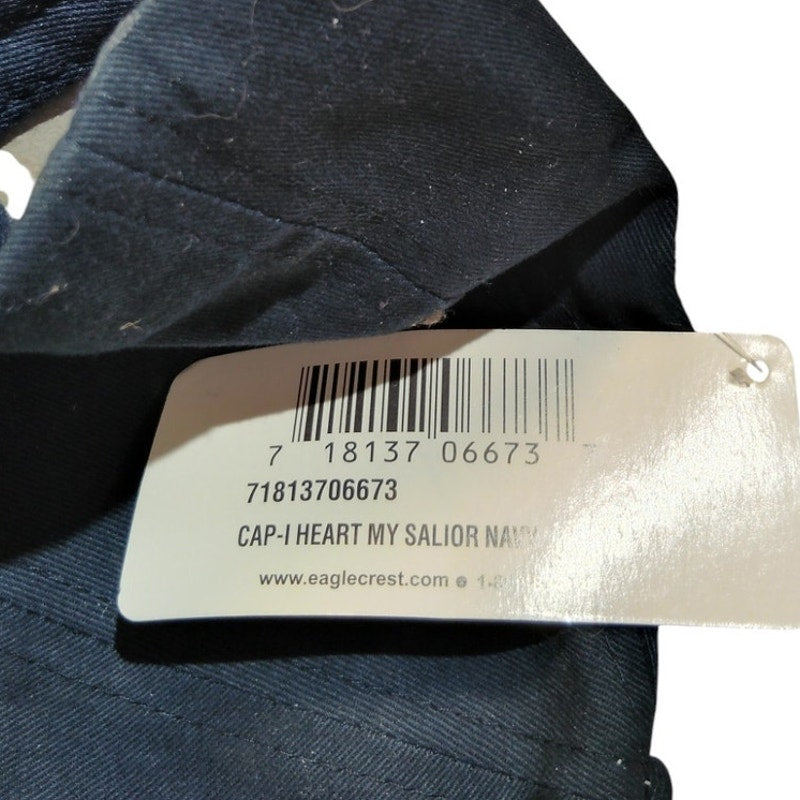 Official Eagle Crest brand cap featuring “I ❤️ MY SAILOR” embroidered on the front and “U.S. NAVY” on the bill. Hook-and-loop back closure for adjustable fit. New with tags. UPC: 718137066737.