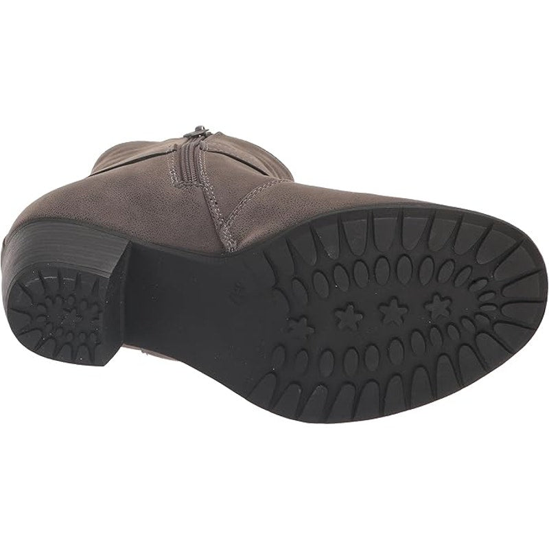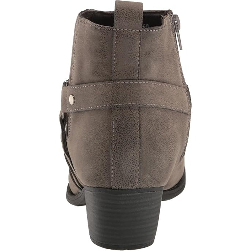 The Easy Street Chicory boot blends rugged charm with feminine detail. Designed in grey matte polyurethane with a 1.5" block heel and thermoplastic sole, this ankle boot features studded strap accents, a side zipper, and a padded footbed for comfort and style.