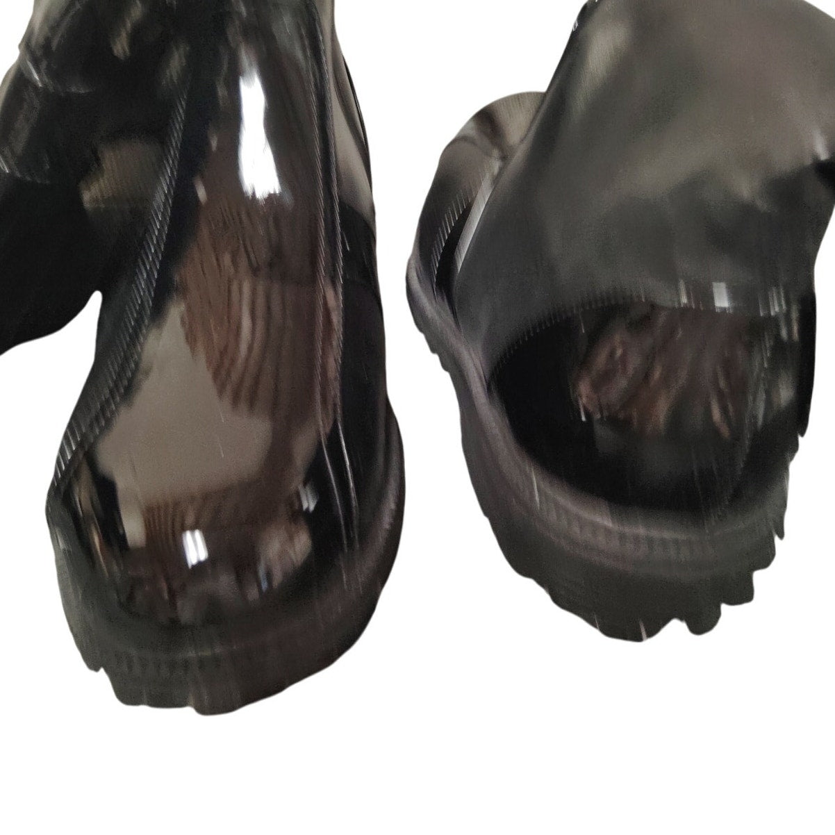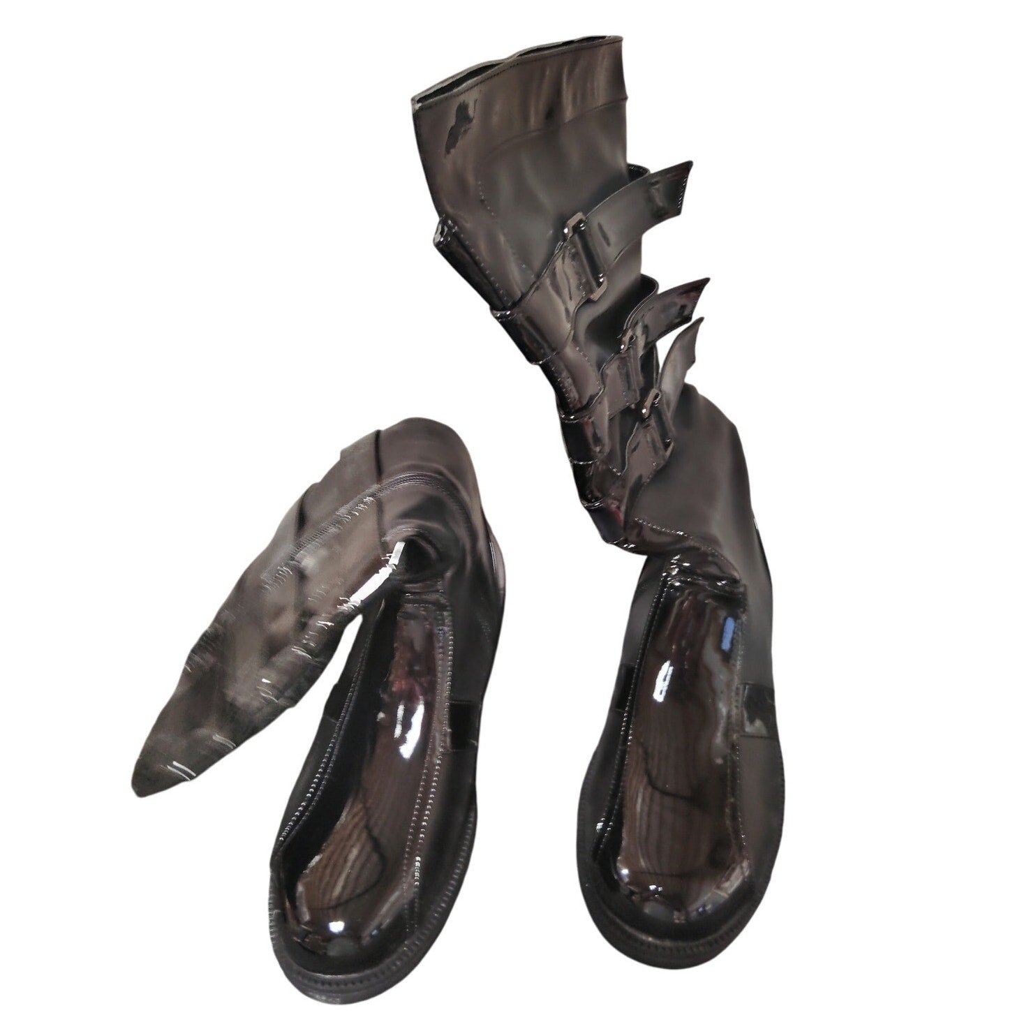Men’s knee-high costume boots featuring three adjustable buckles and a side zipper for easy wear. Designed in matte black polyurethane with a rugged platform sole. Ideal for cosplay, Halloween, or theatrical use. Size Small fits US men’s 8–9.