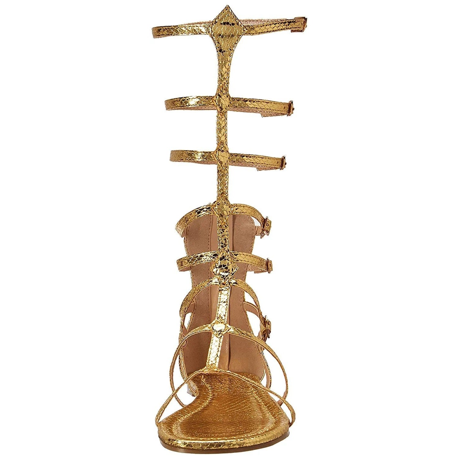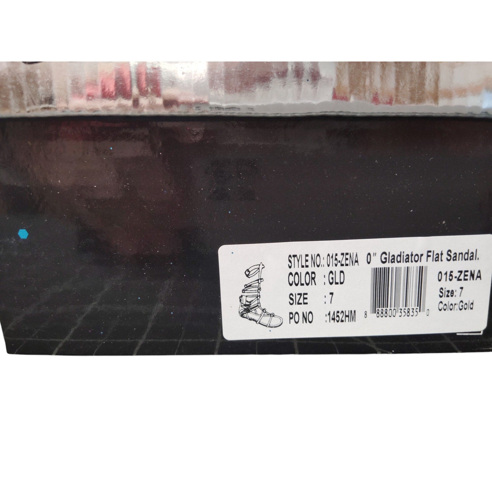 Grecian-inspired gladiator flat sandal designed by Ellie Shoes. Features metallic gold faux leather with strappy detailing and open-toe design. Ideal for costume wear, cosplay, or themed events. Women’s Size 7.