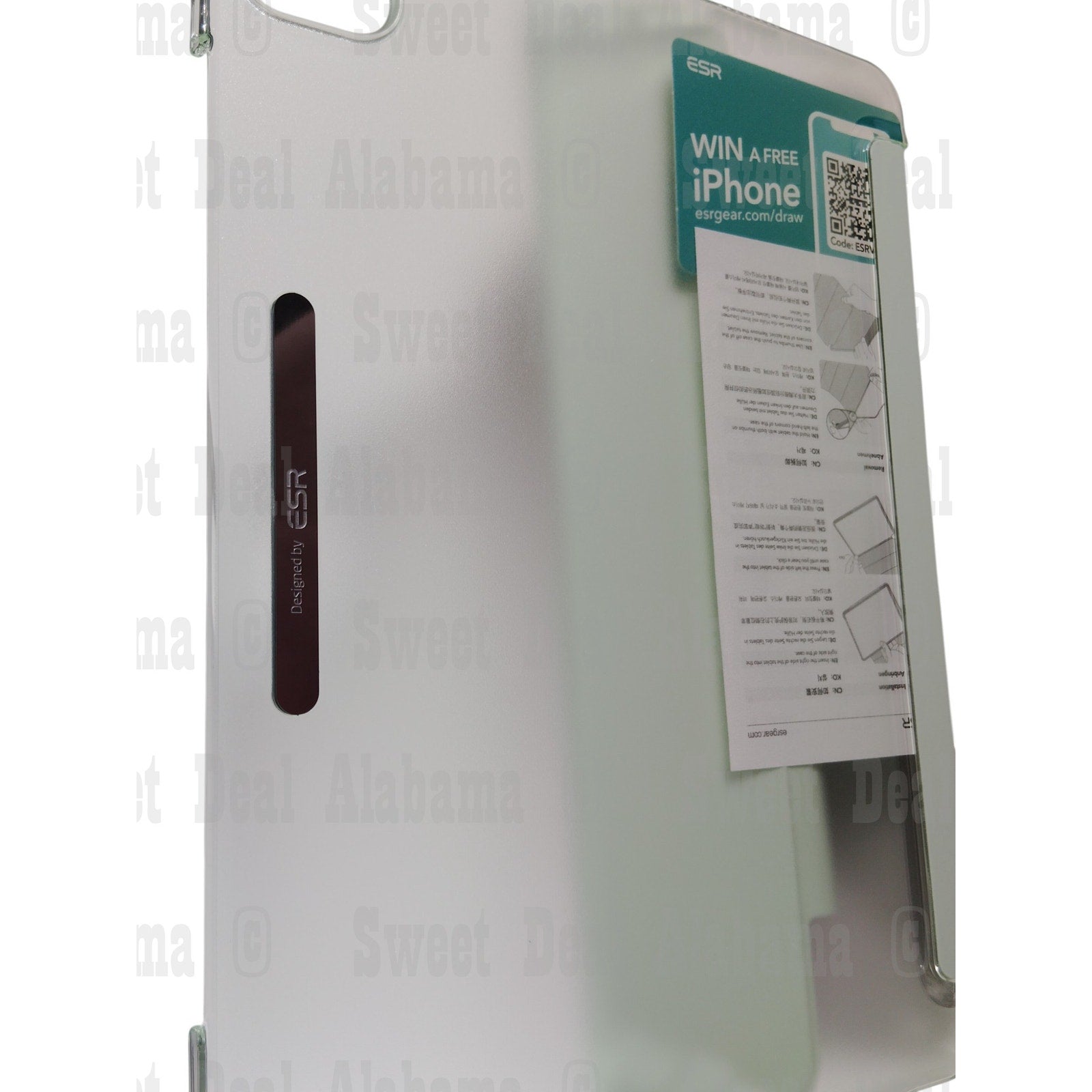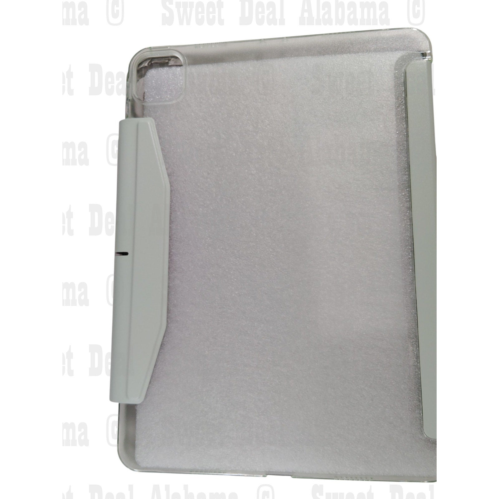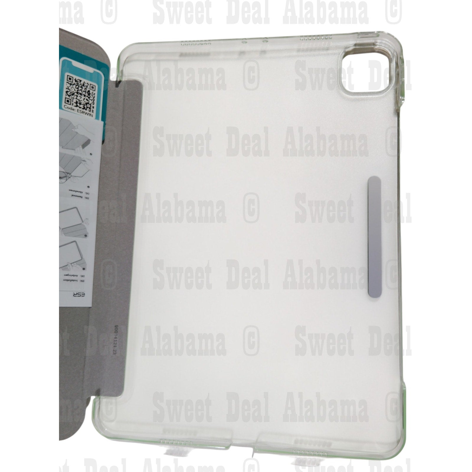The ESR Tablet Case for the Apple iPad Pro 11 (2020) features a transparent design with a white magnetic flap attached to the side. It includes a stand function for adjustable viewing angles and a mint green finish for a sleek look.