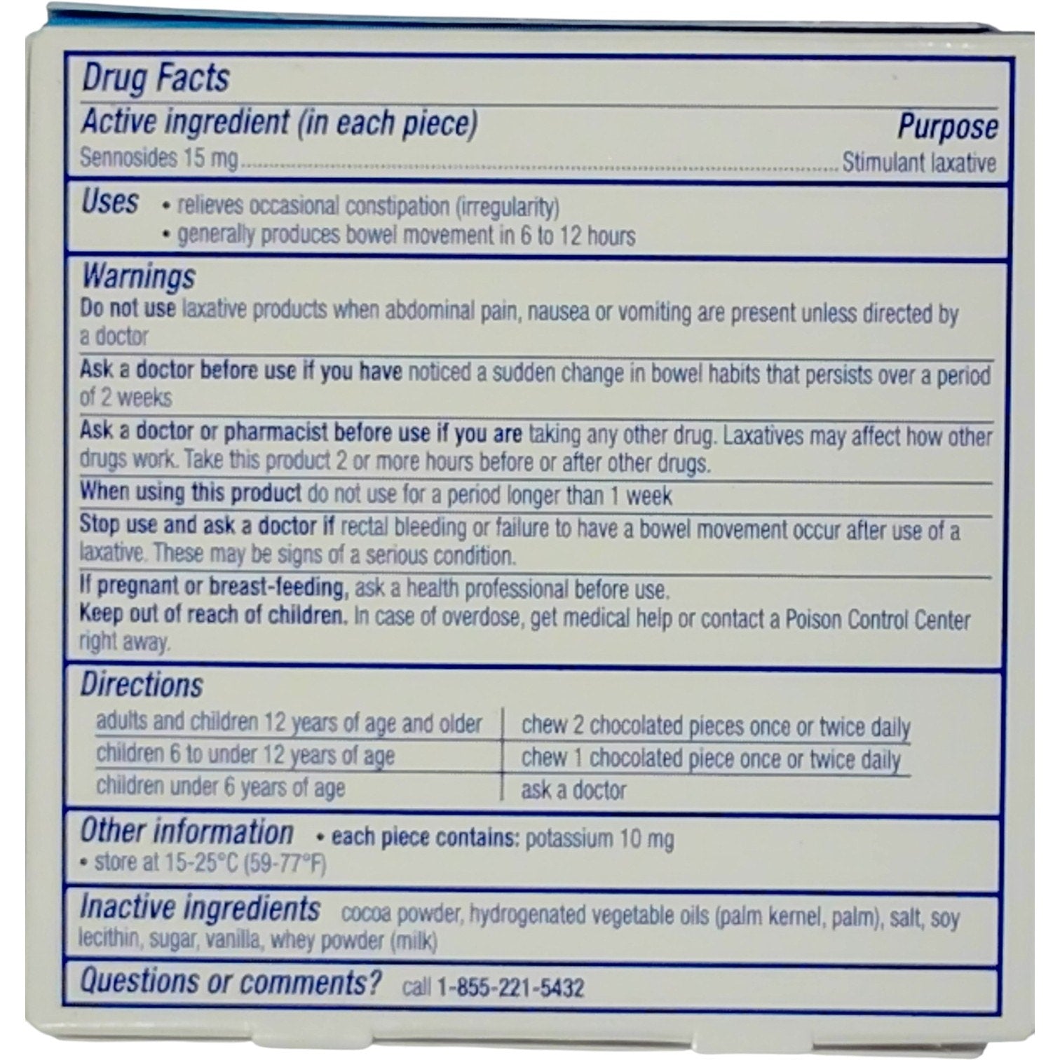 Ex-Lax Regular Strength stimulant laxative in convenient chocolate pieces. Each piece contains 15mg of sennosides to relieve occasional constipation and irregularity. Works gently overnight. Pack includes 12 individually wrapped pieces. Expiration date: 05/31/2027.