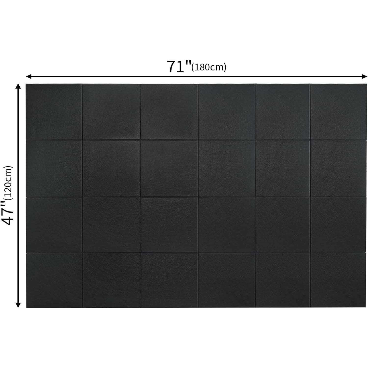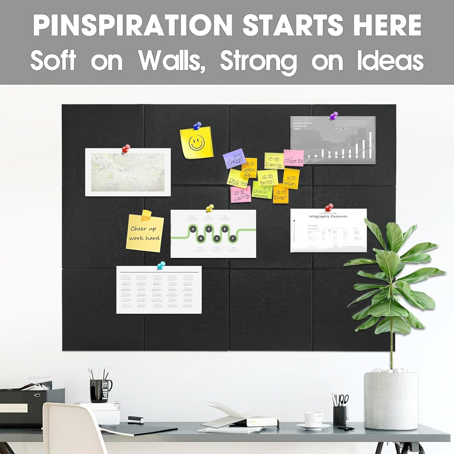 This listing is for a 24-pack of large felt wall tiles, forming a 70" x 47" bulletin board in sleek black. Designed as a modern alternative to traditional cork boards, this set includes 48 safe removable adhesive tabs and 60 push pins, making it ideal for home offices, classrooms, or creative spaces.