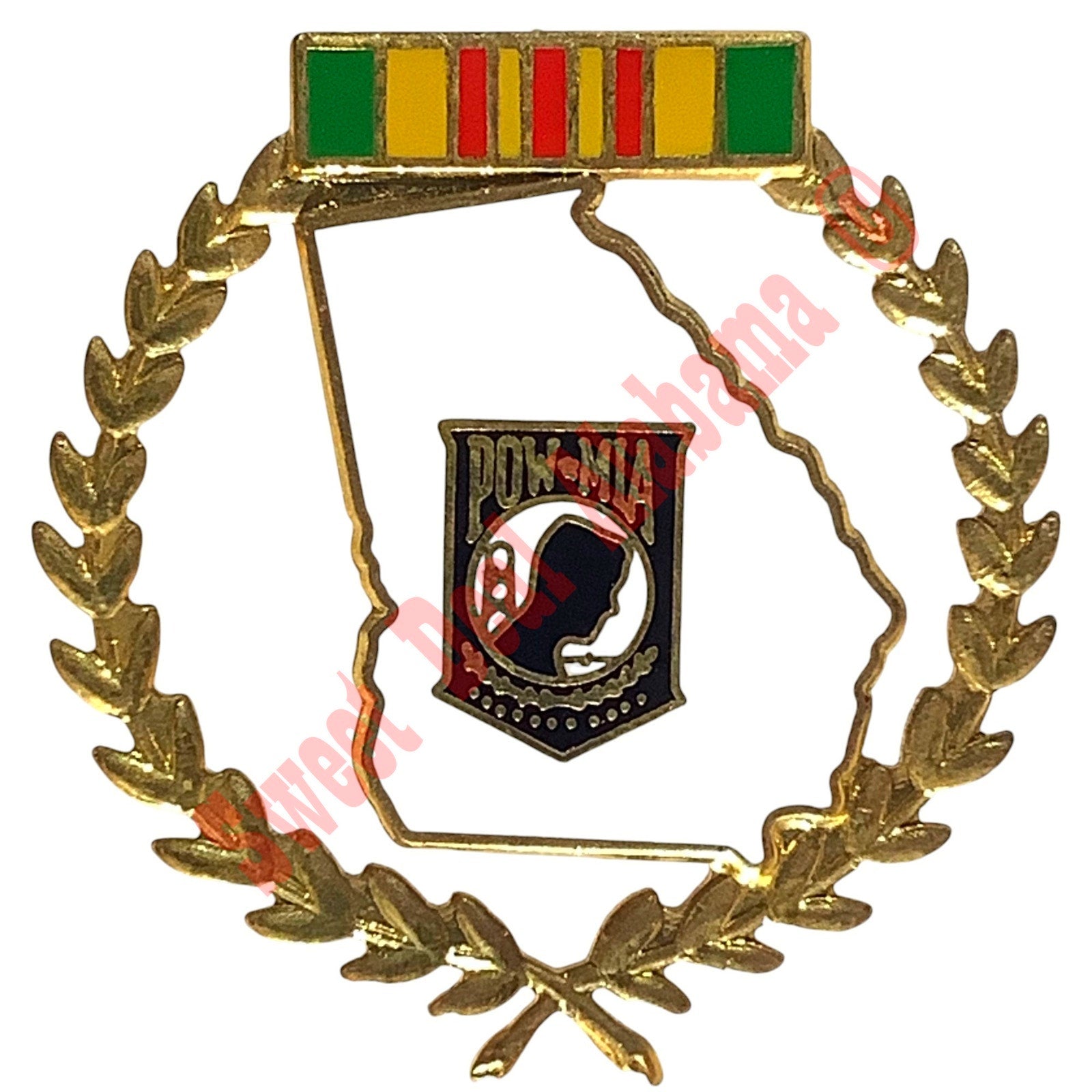 The Georgia Native Vietnam POW/MIA Wreath & Ribbon Hat or Lapel Pin is a meaningful collectible that honors the sacrifices of prisoners of war (POW) and those missing in action (MIA) during the Vietnam War.