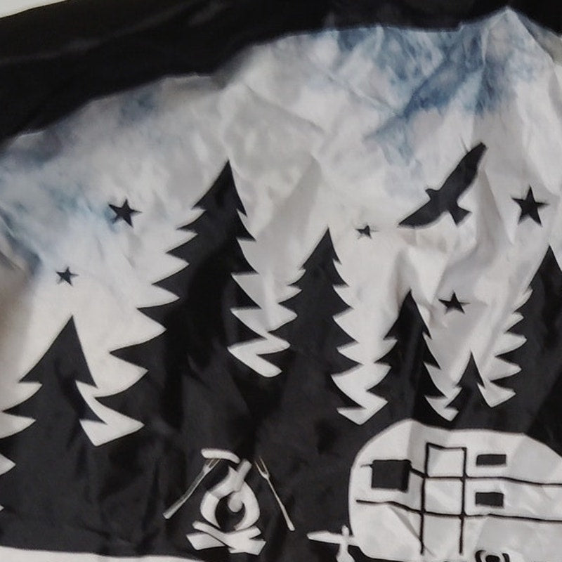 - Design: “Happy Camper” forest scene with camper, campfire, and pine trees