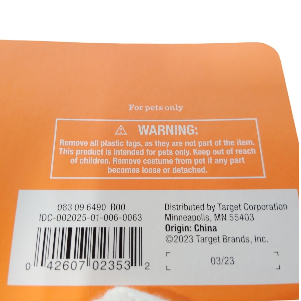This festive, full-body pet sweater from Hyde & EEK! Boutique features vibrant candy-corn inspired stripes in white, orange, and yellow, with “Boo” spelled out in playful black patches across the back. Crafted from midweight knit, it's designed to keep your small dog or cat cozy during the crisp autumn season. Ideal for comfortably holding up to around 40 lb. Pulls on easily through front leg openings.