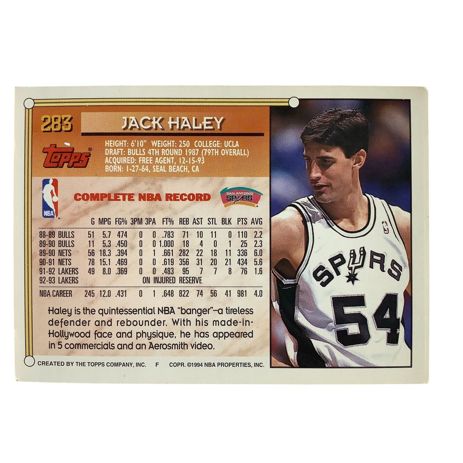 Jack Haley, San Antonio Spurs, 1994 Topps Gold Card 283, EXC