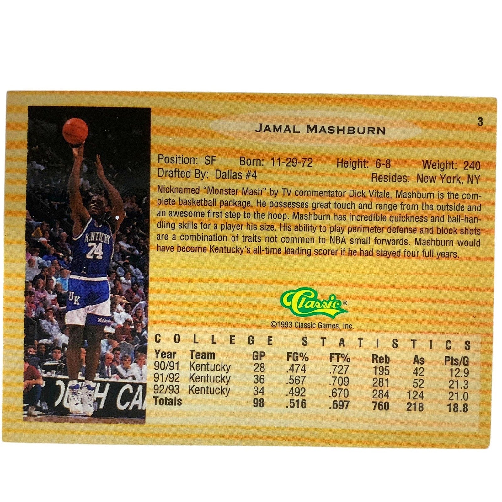 Jamal Mashburn, Mavericks (F), Classics 1994 All-Rookie Team Card 12 EXC/NM