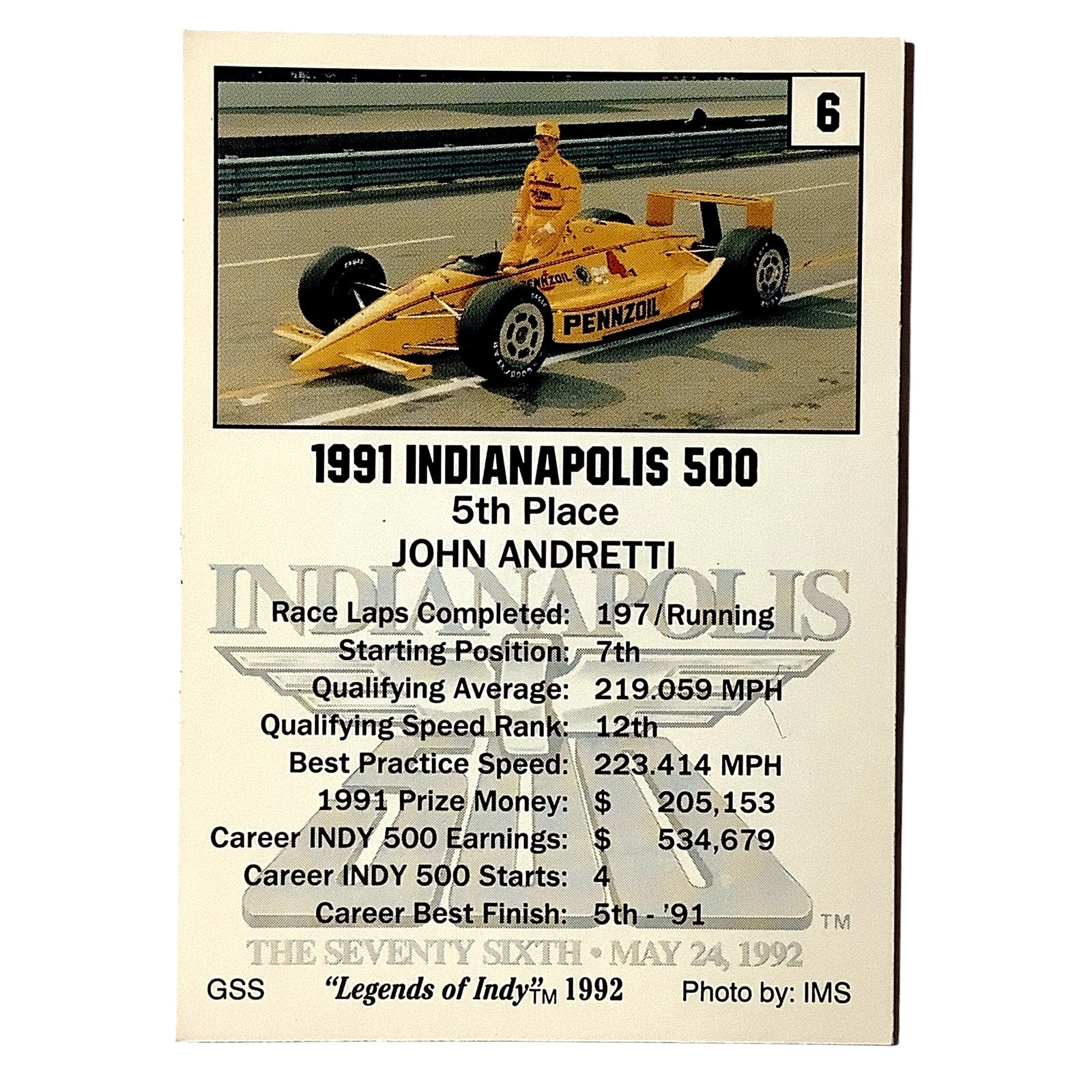 John Andretti 5th Place Indy 500, 1991 Action, 1992 Legends of Indy, Card No.6