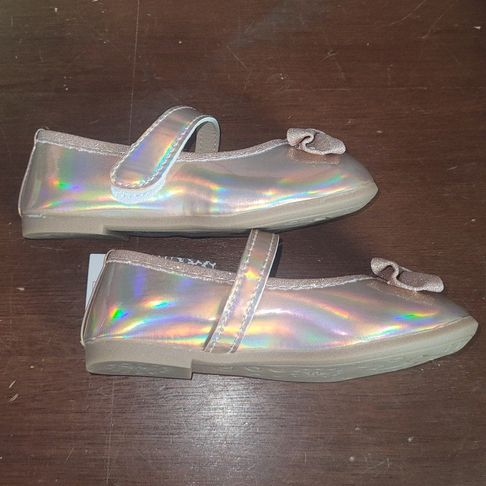 These Kensie Girl ballet flats feature a classic leatherette finish in shimmering rose gold, accented with a glittery bow for extra sparkle. Designed for toddler girls, they offer a comfortable fit with a soft lining and flexible sole—perfect for parties, dress-up, or everyday charm.