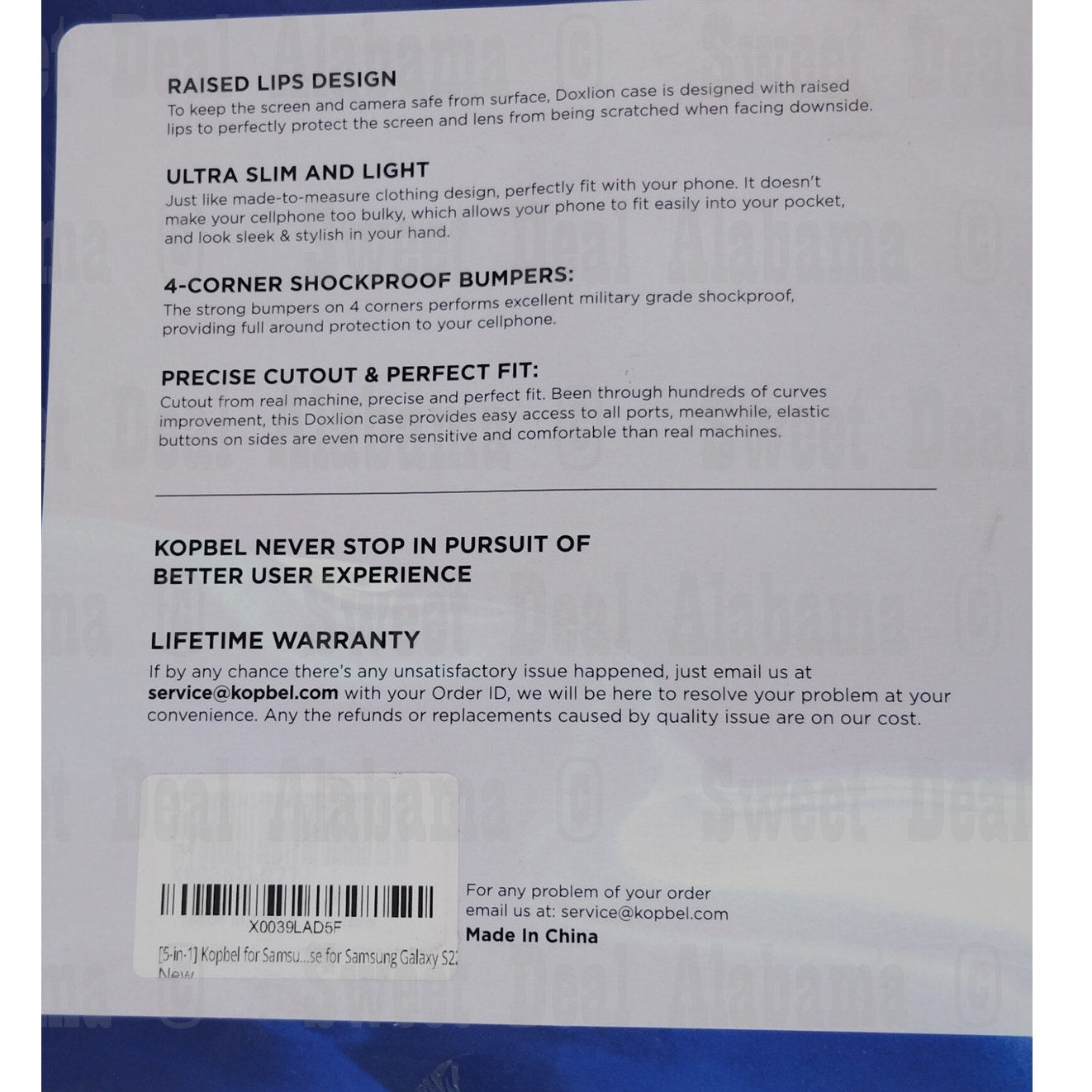 This Kopbell 5-in-1 cellphone case for the Samsung Galaxy S22 features a green finish and includes two screen protectors and two camera lens protectors for comprehensive protection. The packaging highlights several key features: