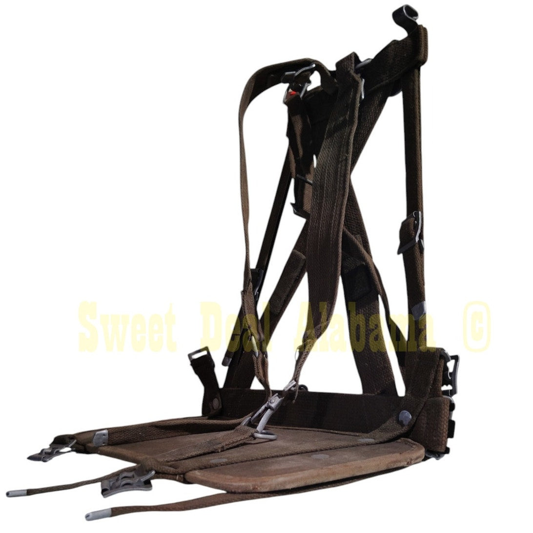 Based on the design details—such as the durable, padded construction, multiple adjustable straps with metal clips,—it appears that this harness frame likely dates from the mid‑20th century, roughly aligning with military surplus gear from the late Korean War to early 1970s. This period saw the widespread use of rugged, fabric-based rigging systems for backpacks and other field equipment, and the design here is consistent with those elements.