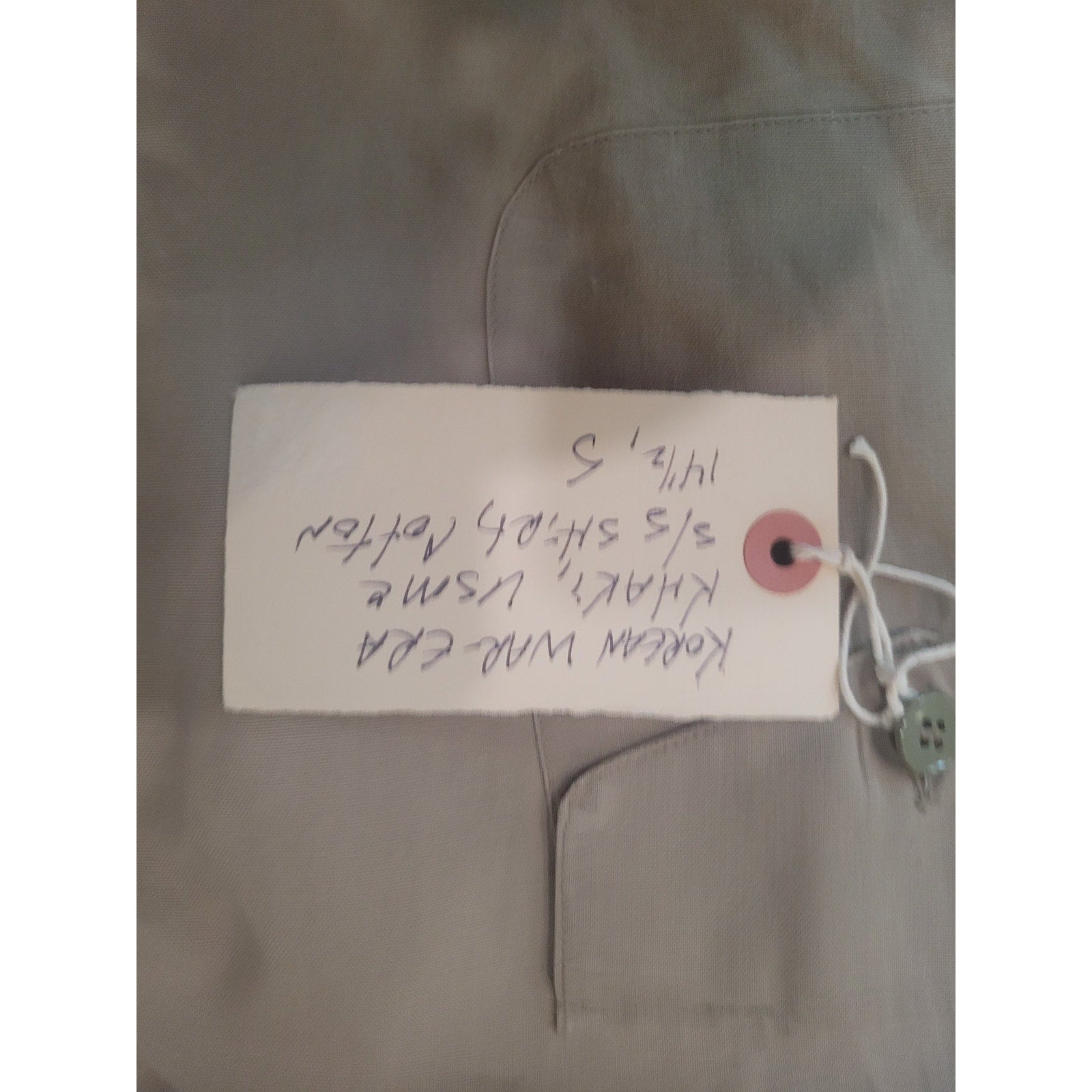 Authentic Korean War era short sleeve khaki service shirt issued by the U.S. military. Constructed from durable cotton with a classic pointed collar and button front. Tagged size Small with a 14½" neck. NSN 8405-926-4914. Ideal for collectors, reenactors, or vintage uniform enthusiasts seeking early Cold War period garments.