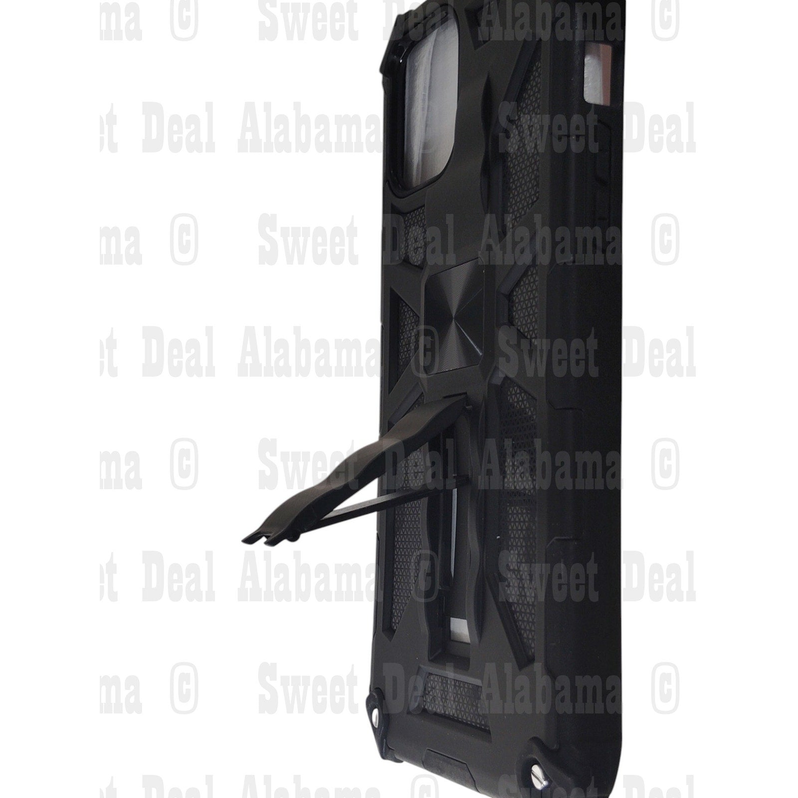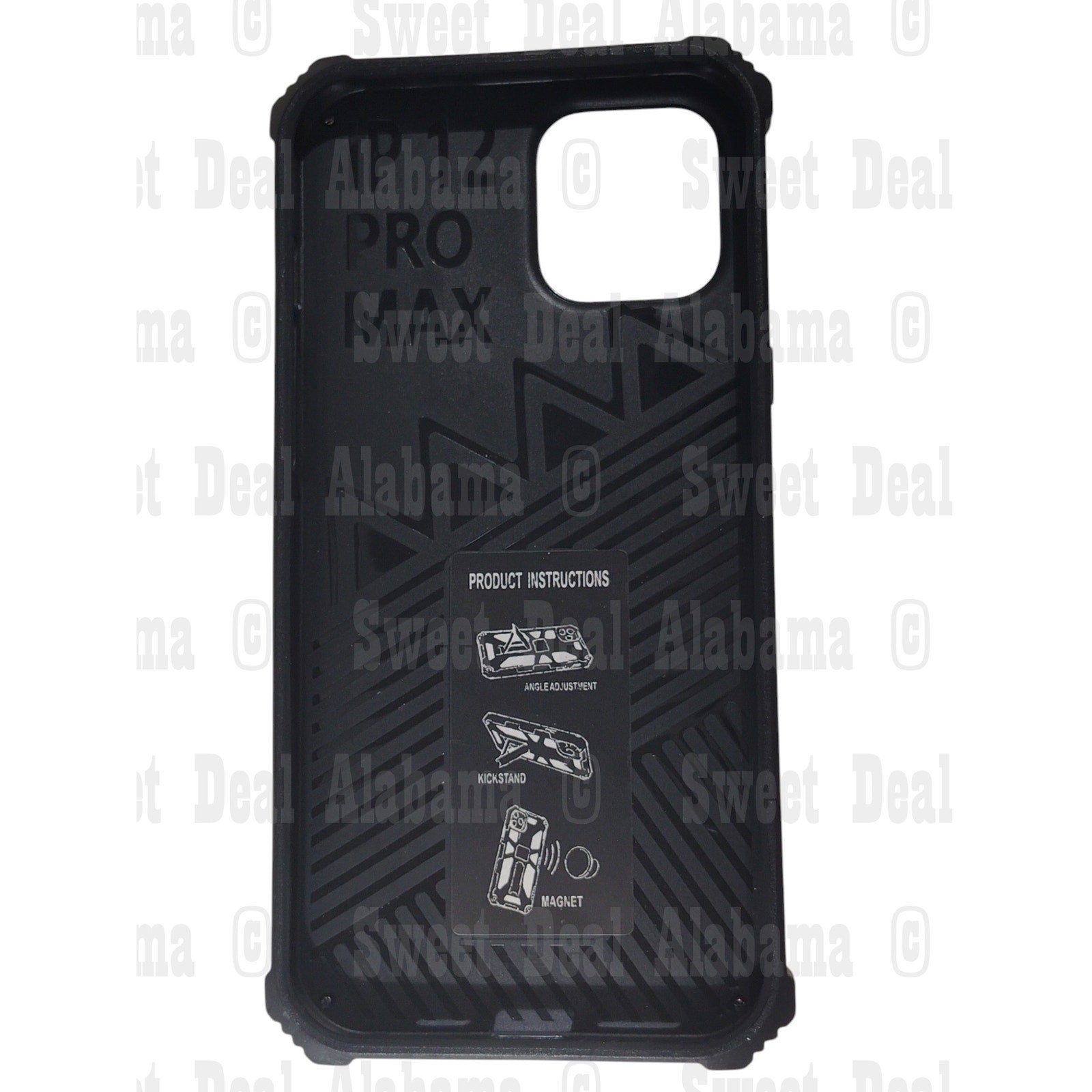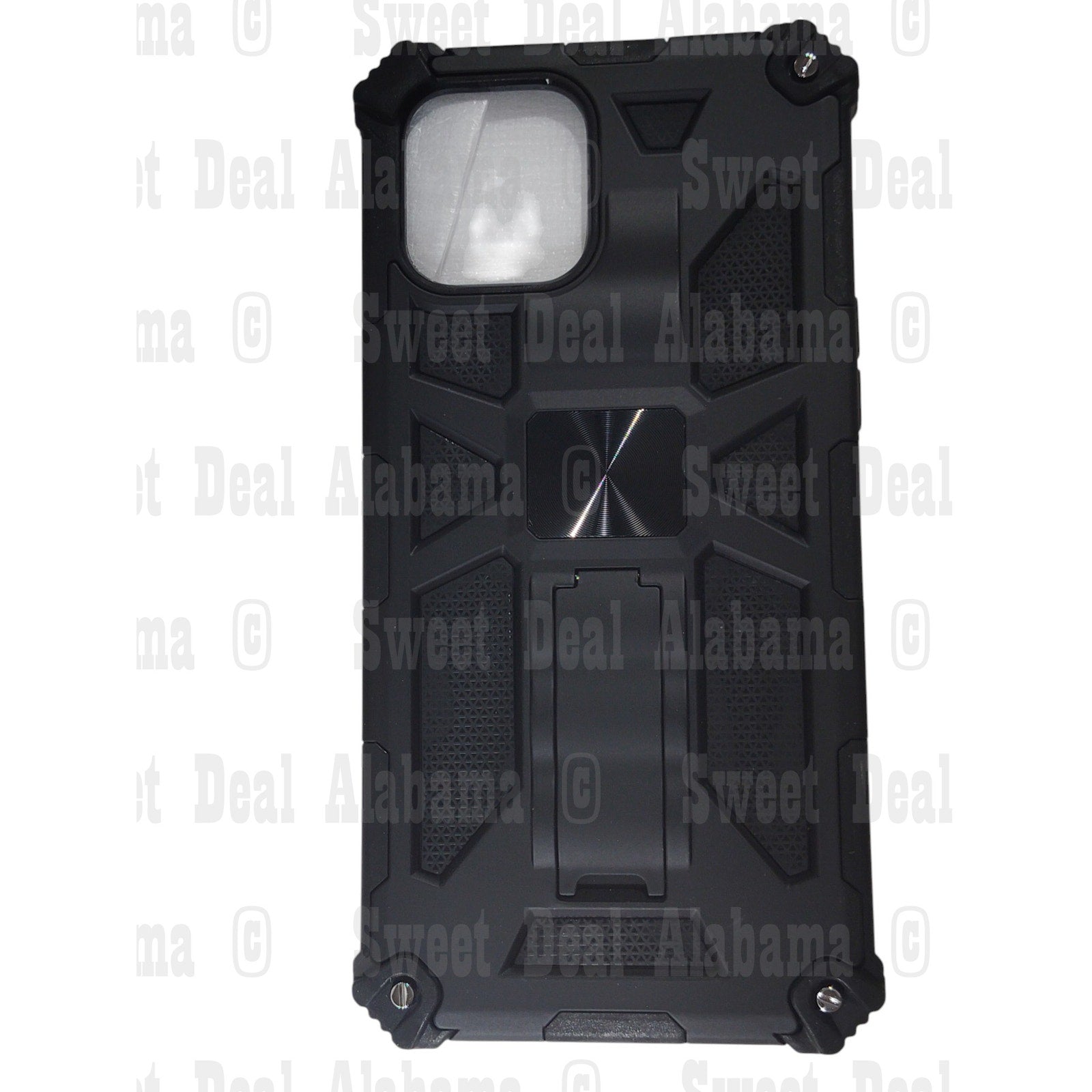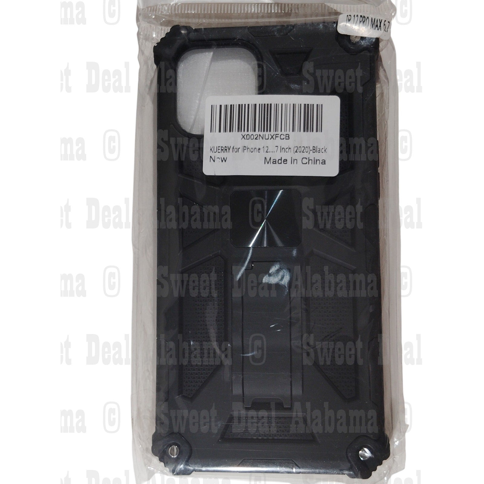 This Kuerry Cellphone Case is designed for the iPhone 12 Pro Max and features a rugged black design with reinforced corners for enhanced drop protection. The case includes a built-in kickstand, allowing for hands-free viewing, and is made of durable materials to safeguard against impacts.