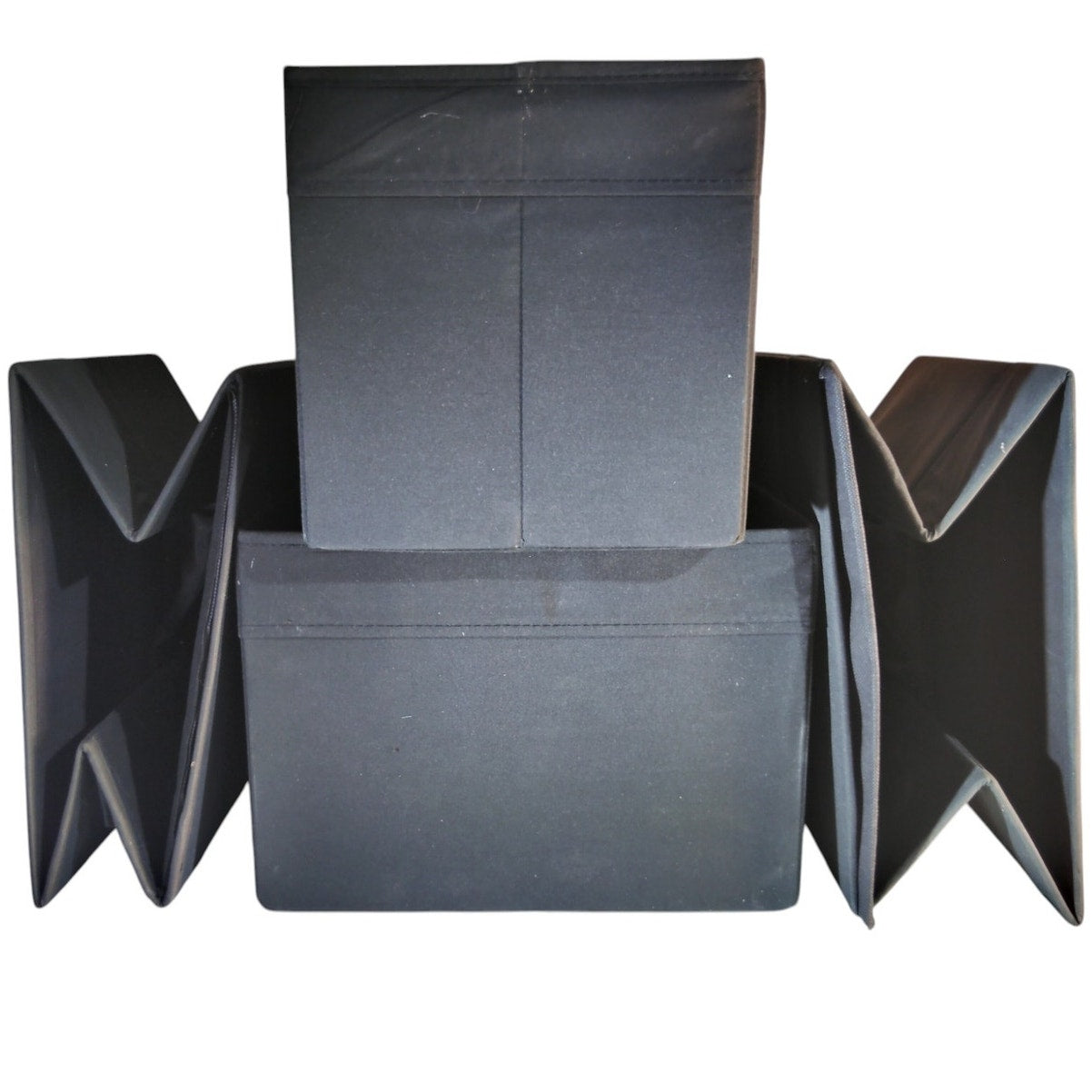 Set of four original IKEA fabric storage tubs in black. Each box measures approximately 14″ × 10″ × 10″ and is constructed from durable, collapsible fabric with reinforced sides. Ideal for organizing shelves, closets, or cube systems. These tubs are compatible with IKEA shelving units and feature stitched handles for easy access. Model identifiers include NO 195546, 2045-104, and NIF No. 39118571. All items are pre-owned and in clean, functional condition.