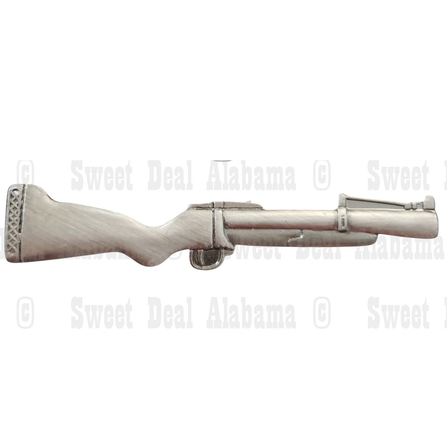 - Design: Raised profile with barrel, stock, and trigger detail in left-facing silhouette