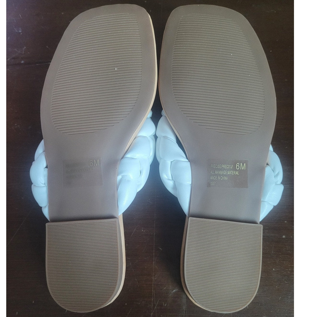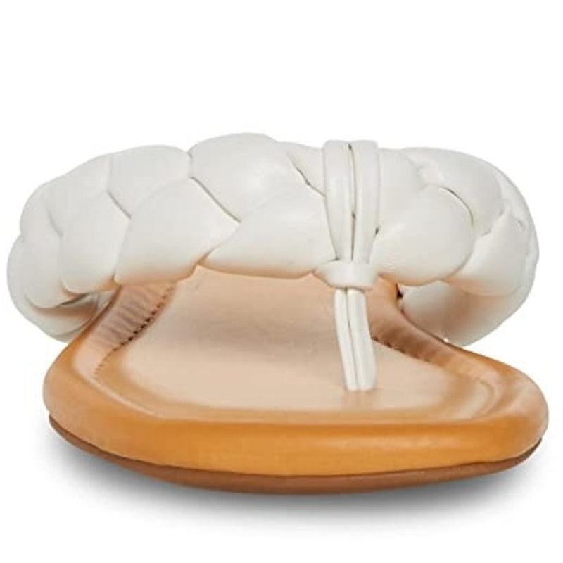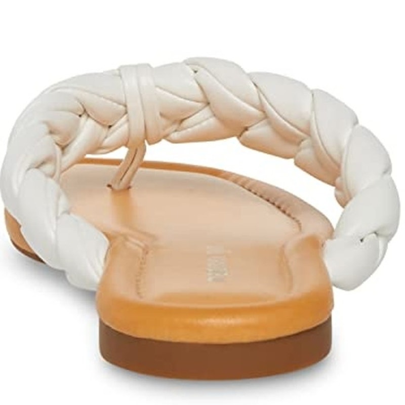 The Madden Girl Precise sandal features a braided strap and thong toe post in a sleek White Paris finish. Designed for casual wear, this flat slip-on sandal offers a padded footbed and lightweight sole for warm-weather comfort.