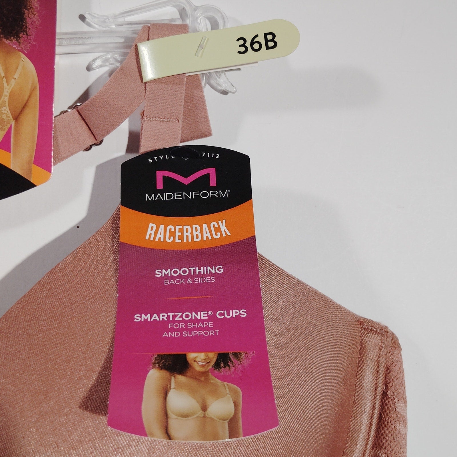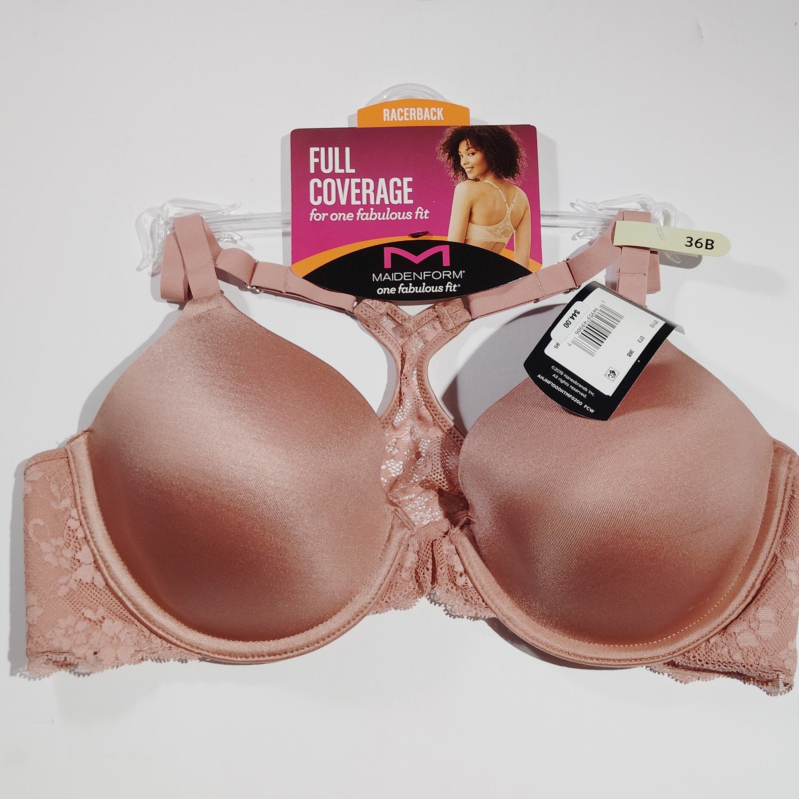 Maidenform One Fab Fit Lightly-Lined Underwire T-Shirt Bra (Style 07112), size 36B, in Misted Rose. This racerback bra features SmartZone cups for targeted uplift and shaping, with a smooth, lightly-lined design ideal for everyday wear. The front closure offers easy on/off convenience, while the lace T-back keeps straps hidden under sleeveless tops. Retired color Misted Rose adds a soft, feminine touch to this versatile silhouette.