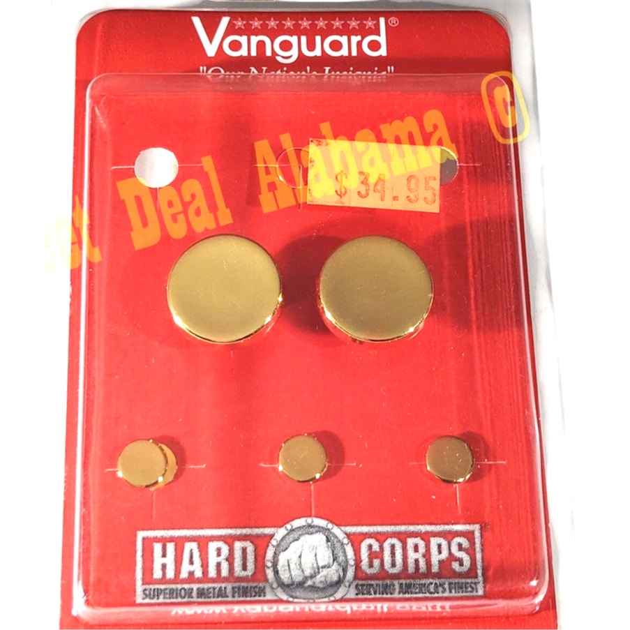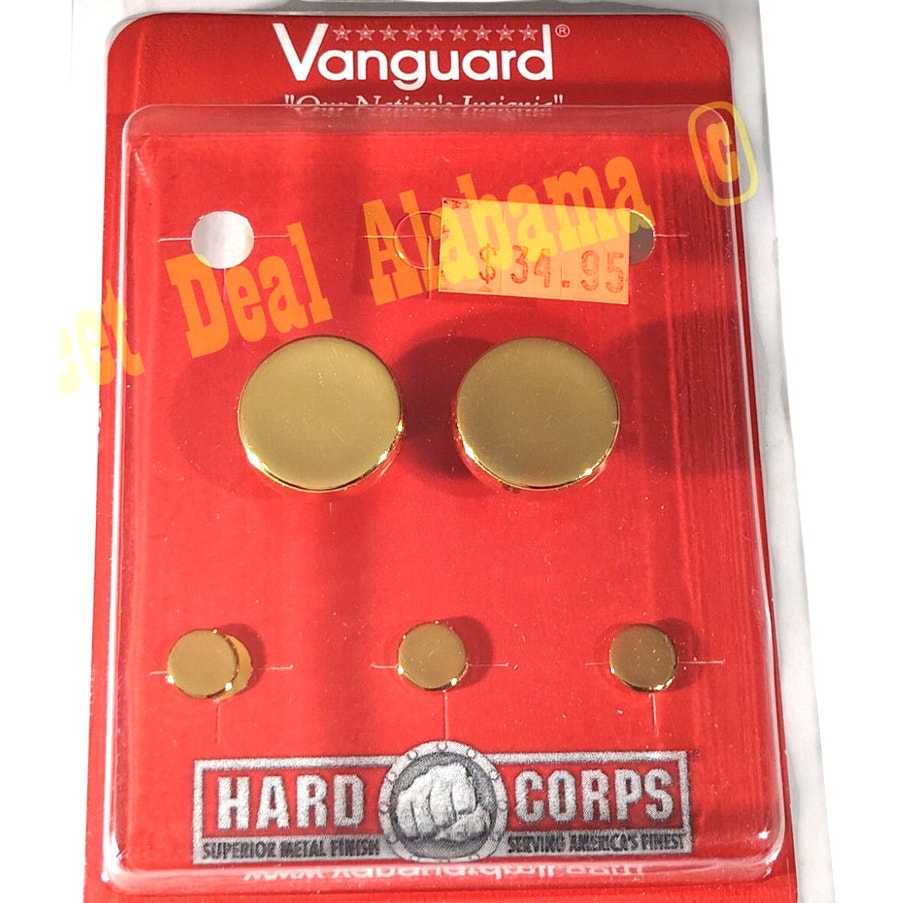 The Marine Corps Anodized 22k Gold Cufflinks & Studs Set includes cuff links and three shirt studs, all featuring a concave design and anodized 22k gold plating.