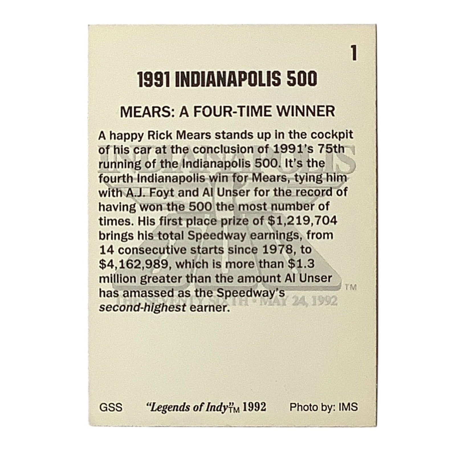 Mears: A Four Time Winner of Indy 500, 1991 Action, 1992 Legends of Indy, Card 1