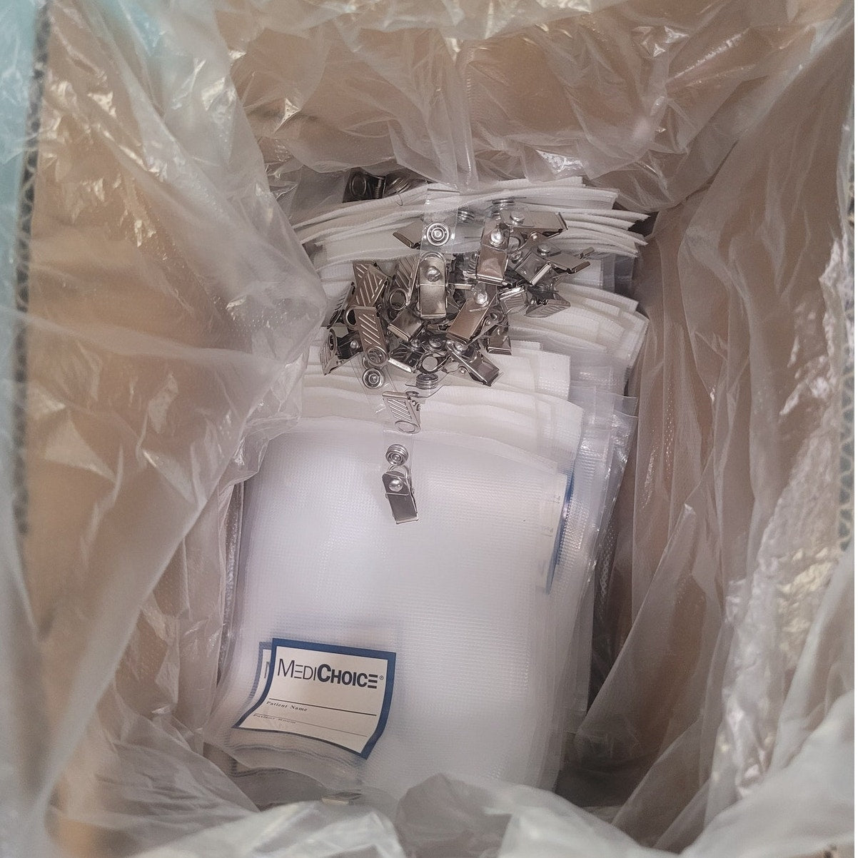 Box of 50 MediChoice MC500 telemetry pouches made of clear polyethylene. Each pouch measures 5-1/4" x 8-1/8" and features a hook & loop closure for secure containment of telemetry transmitters. Includes pre-attached patient ID label, easily removable if repurposing is desired. Designed for clinical use to protect devices from fluids while allowing wire pass-through. New in box.