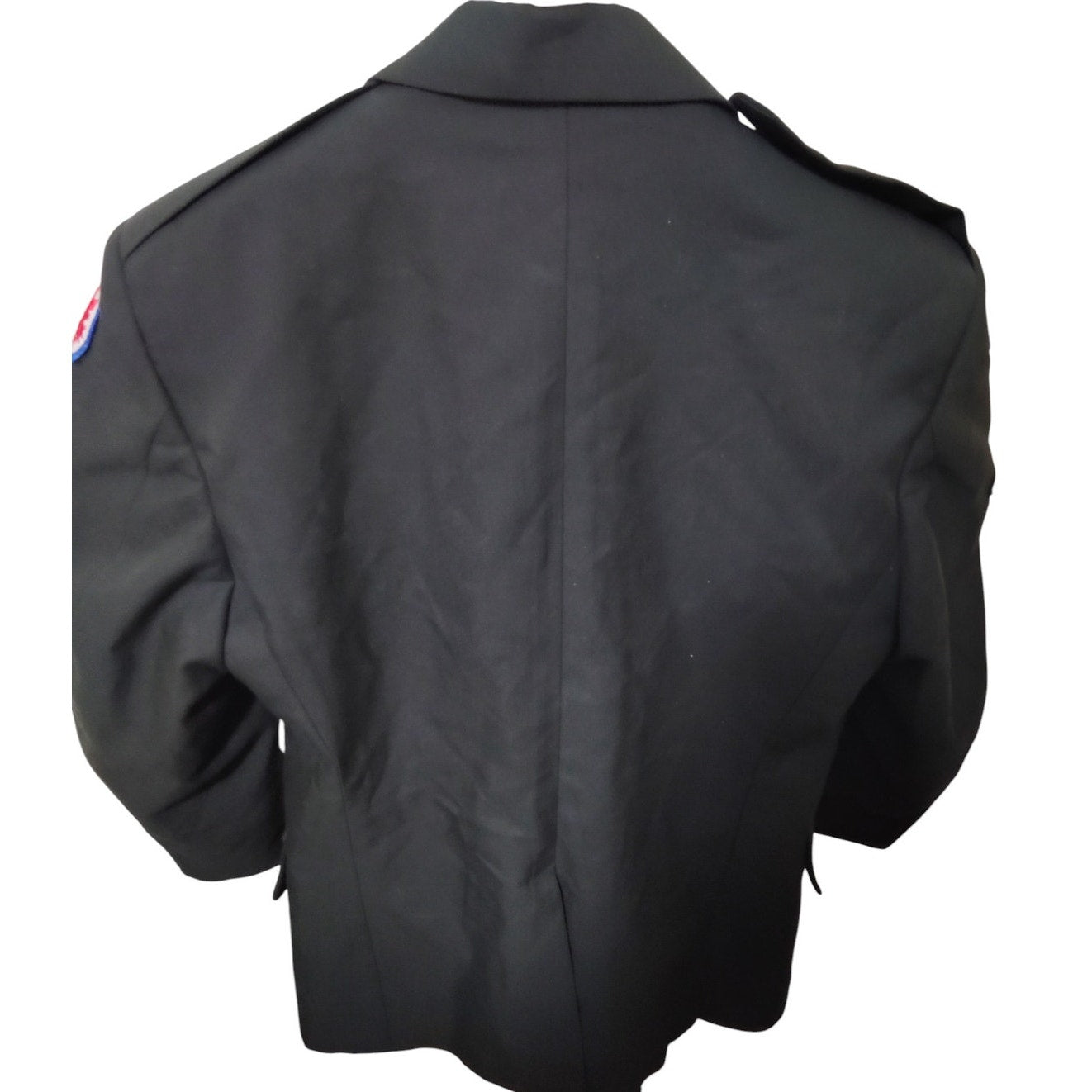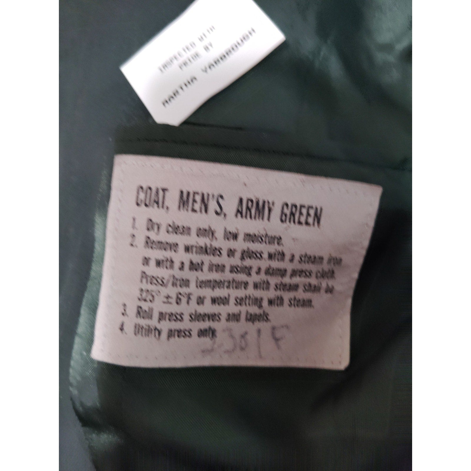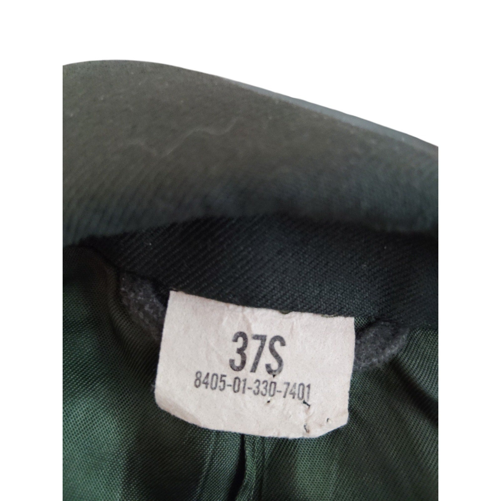 Authentic U.S. Army Men’s Green Class A Service Coat, size 37 Short. Constructed of a durable 55% polyester / 45% wool blend. This coat is in excellent condition, with two buttons (one epaulet, one front) removed for safe shipping and placed in a bag attached to the package; they will need to be reattached. The coat includes original insignia patches, making it a collectible Cold War/early 2000s era piece.