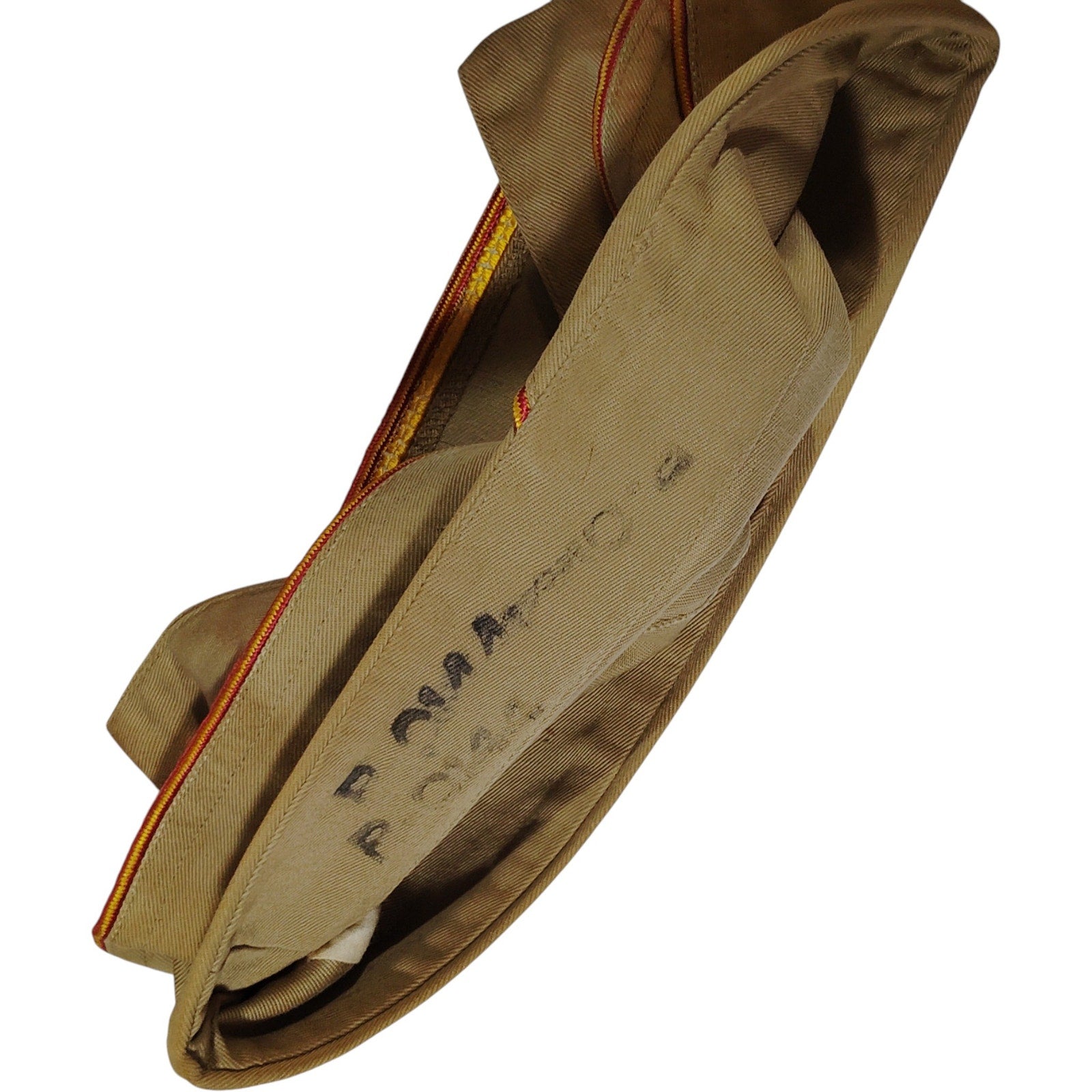 Authentic mid-20th century U.S. military overseas garrison cap in khaki cotton twill, size 7-1/4. Features distinctive red and gold branch piping along the upper seam, typically associated with the U.S. Army Artillery Corps or support units. Tag is illegible, but construction style and materials suggest production between WWII and the Korean War era. Wedge-style contour with internal stitching and reinforced seams. No insignia attached. Ideal for collectors, reenactors, or uniform restoration. Light wear consistent with age; no major defects.
