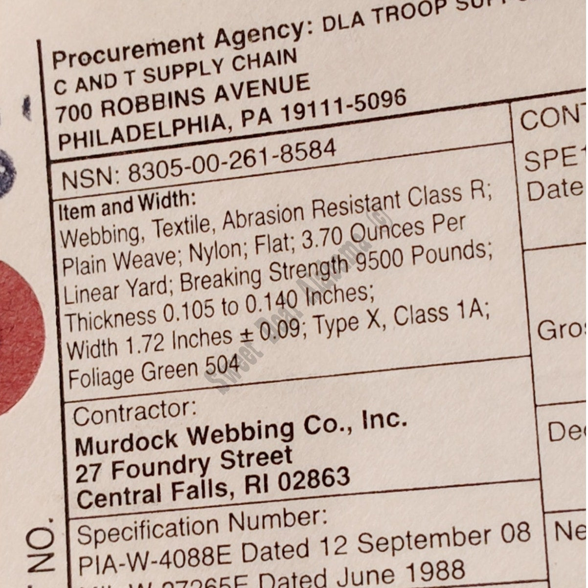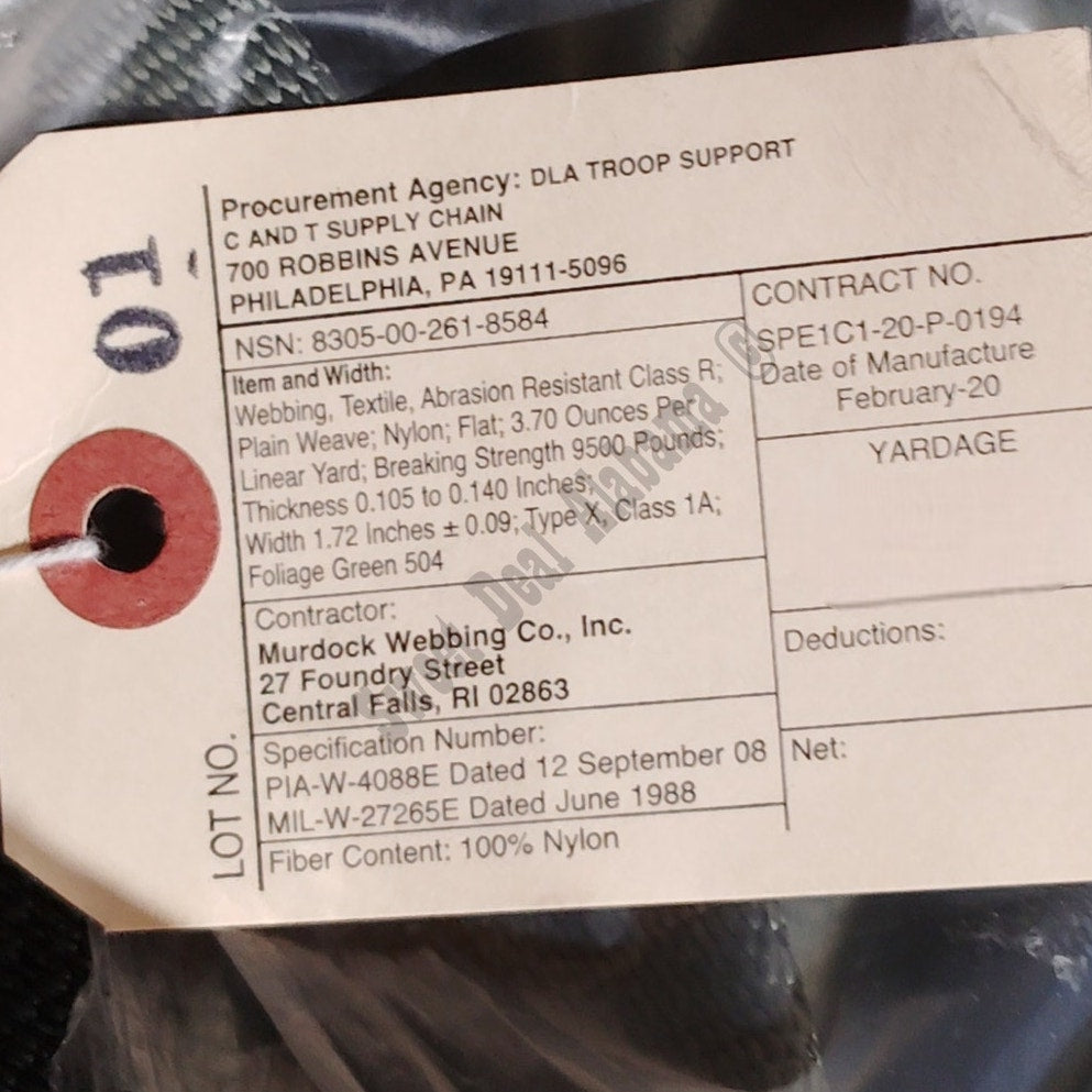 Military Nylon Webbing -Yard, Foliage Green, Strength 9500 Lb., 1.72"W (+/- .09)