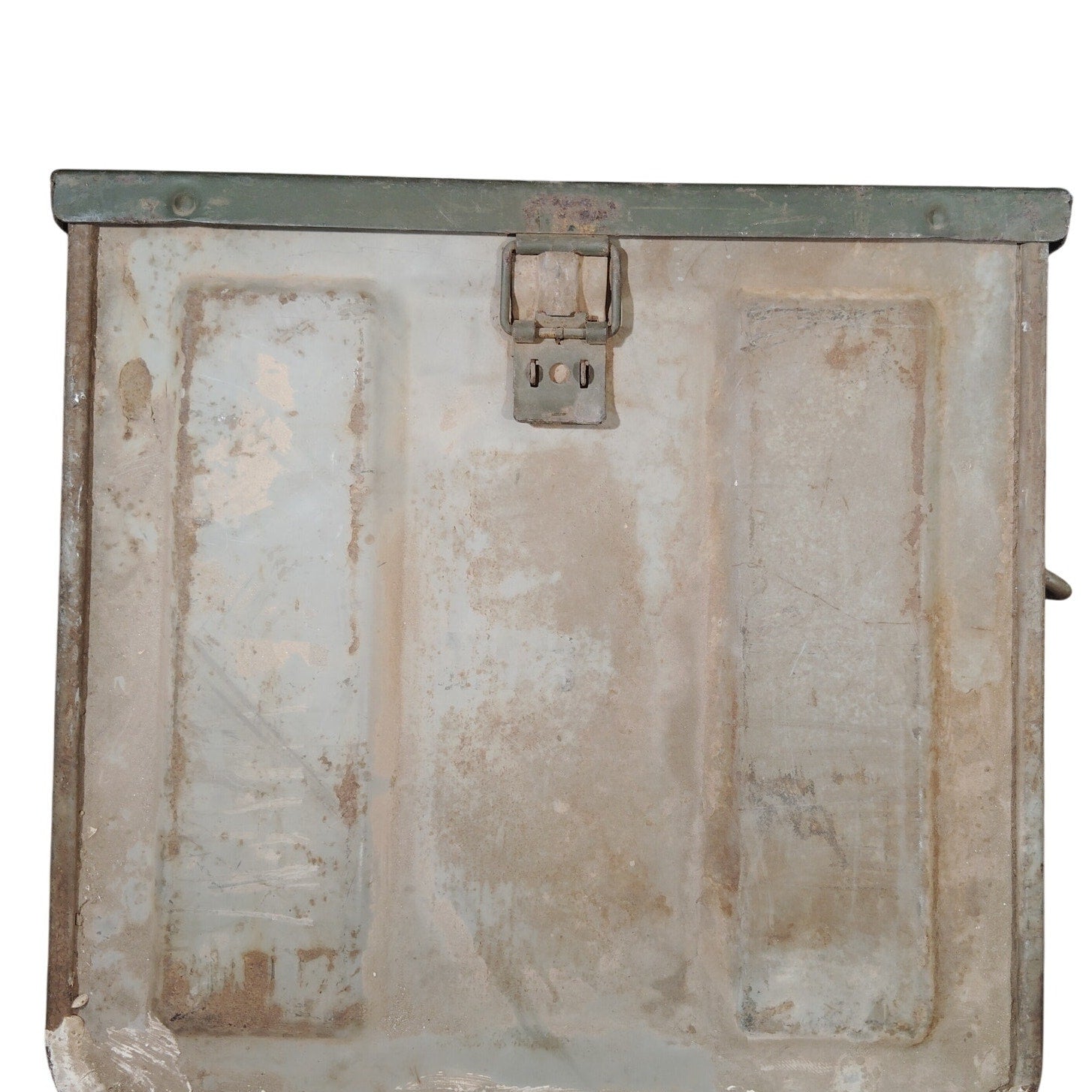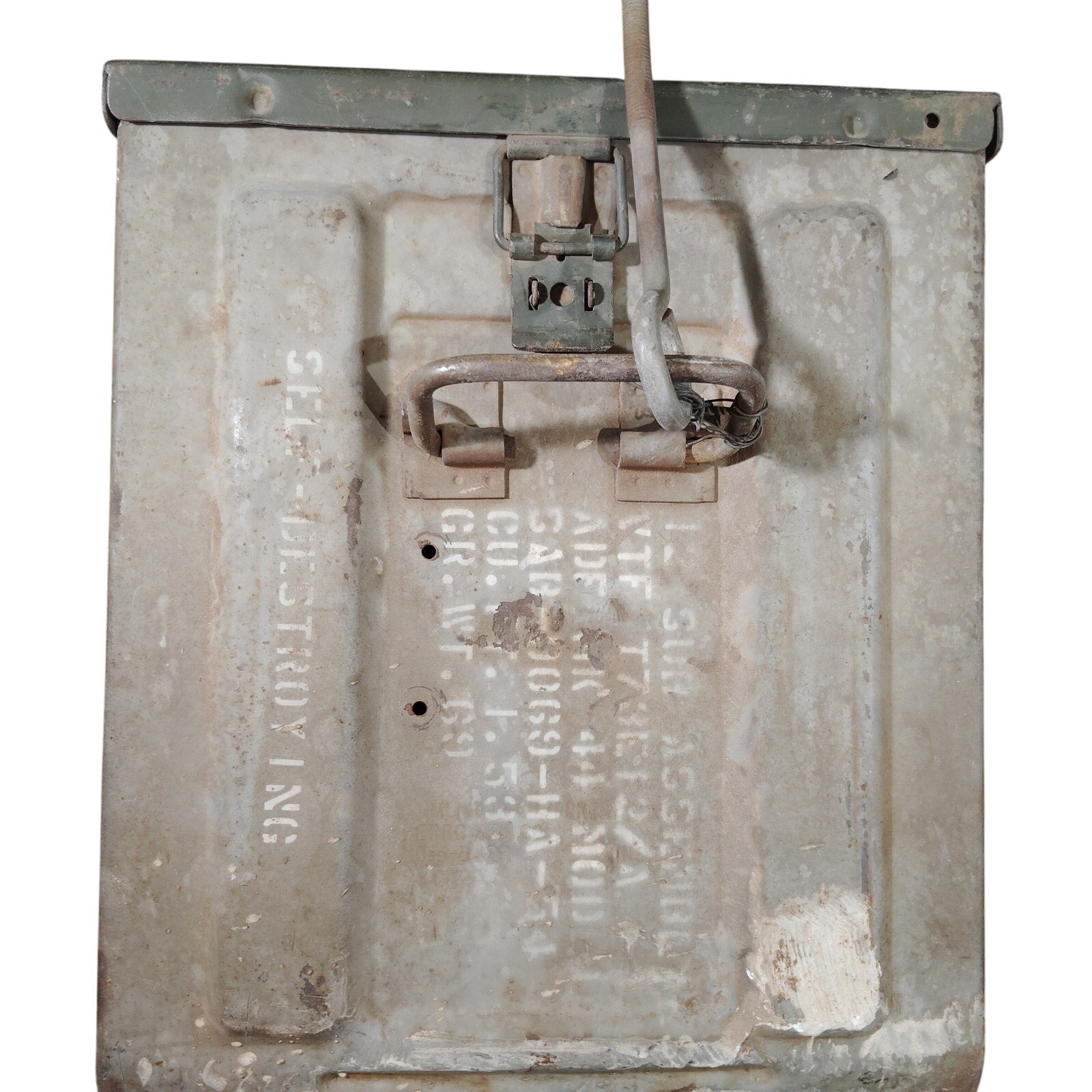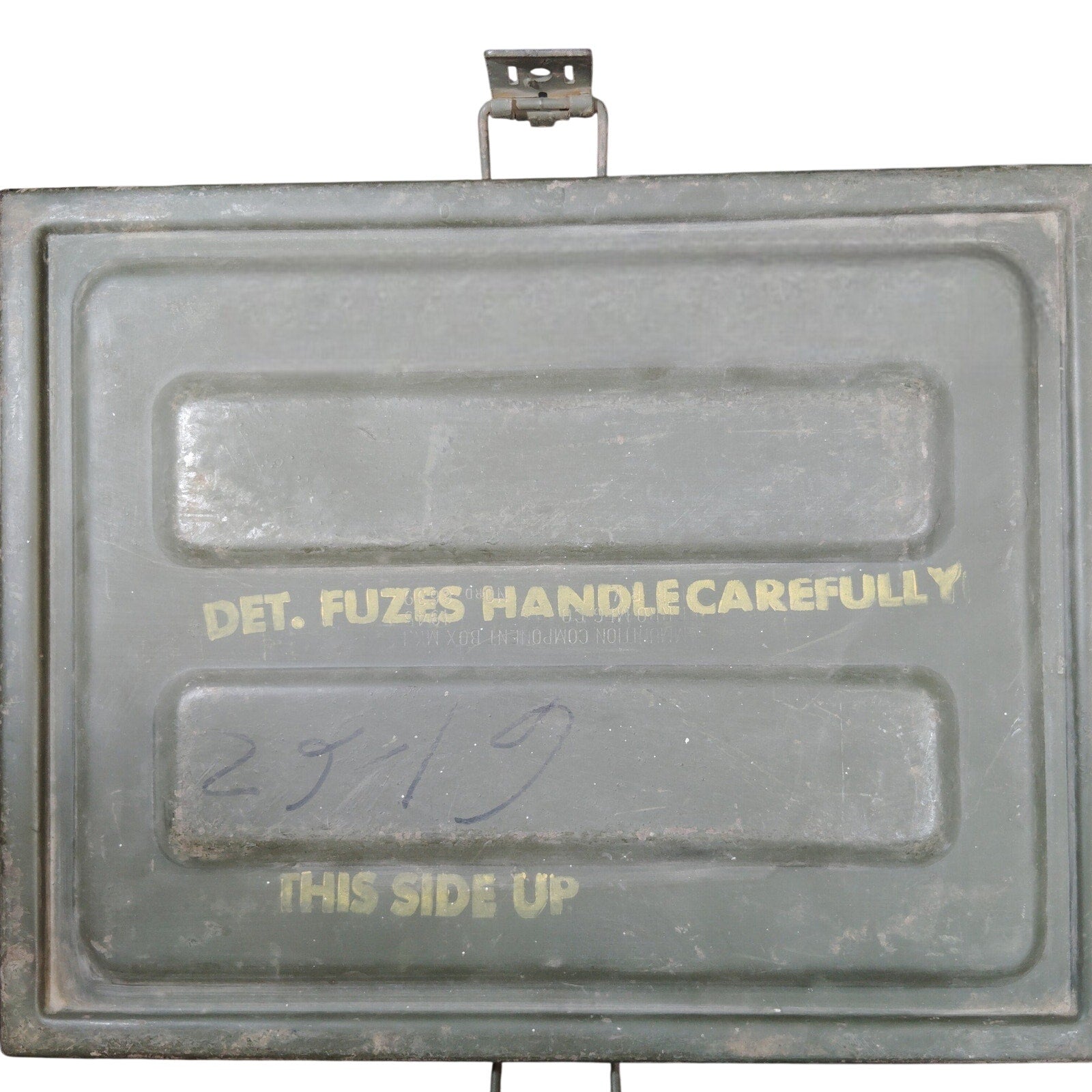 Authentic military surplus metal fuze box originally used for storage and transport of ordnance sub‑assemblies, including the ADF Mk 44 Mod auxiliary detonating fuze. This rugged steel container is marked with contract and lot identifiers (e.g., SAB‑9069‑HA‑54), likely dating production to 1954. The box has reinforced seams, hinged lid, and secure latch closure. While showing minor signs of handling consistent with age, it remains in Excellent Used Condition (EUC) with no structural damage. A rare collectible piece for military historians, ordnance collectors, or display enthusiasts.