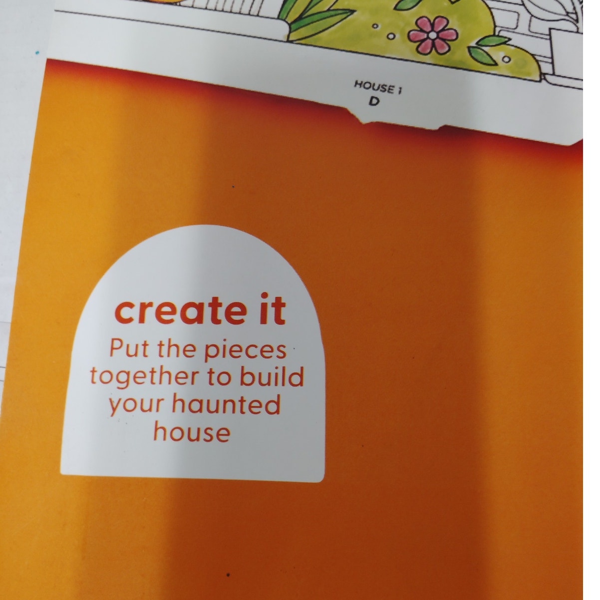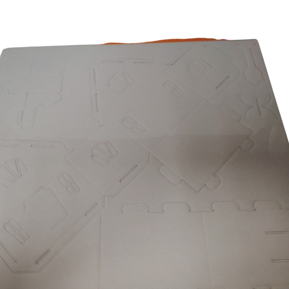 DIY Halloween craft kit featuring pre-cut corrugated board pieces that assemble into a large haunted village scene. Includes diagrammed layout for guided construction and coloring. Ideal for seasonal décor, classroom projects, or creative family activities.