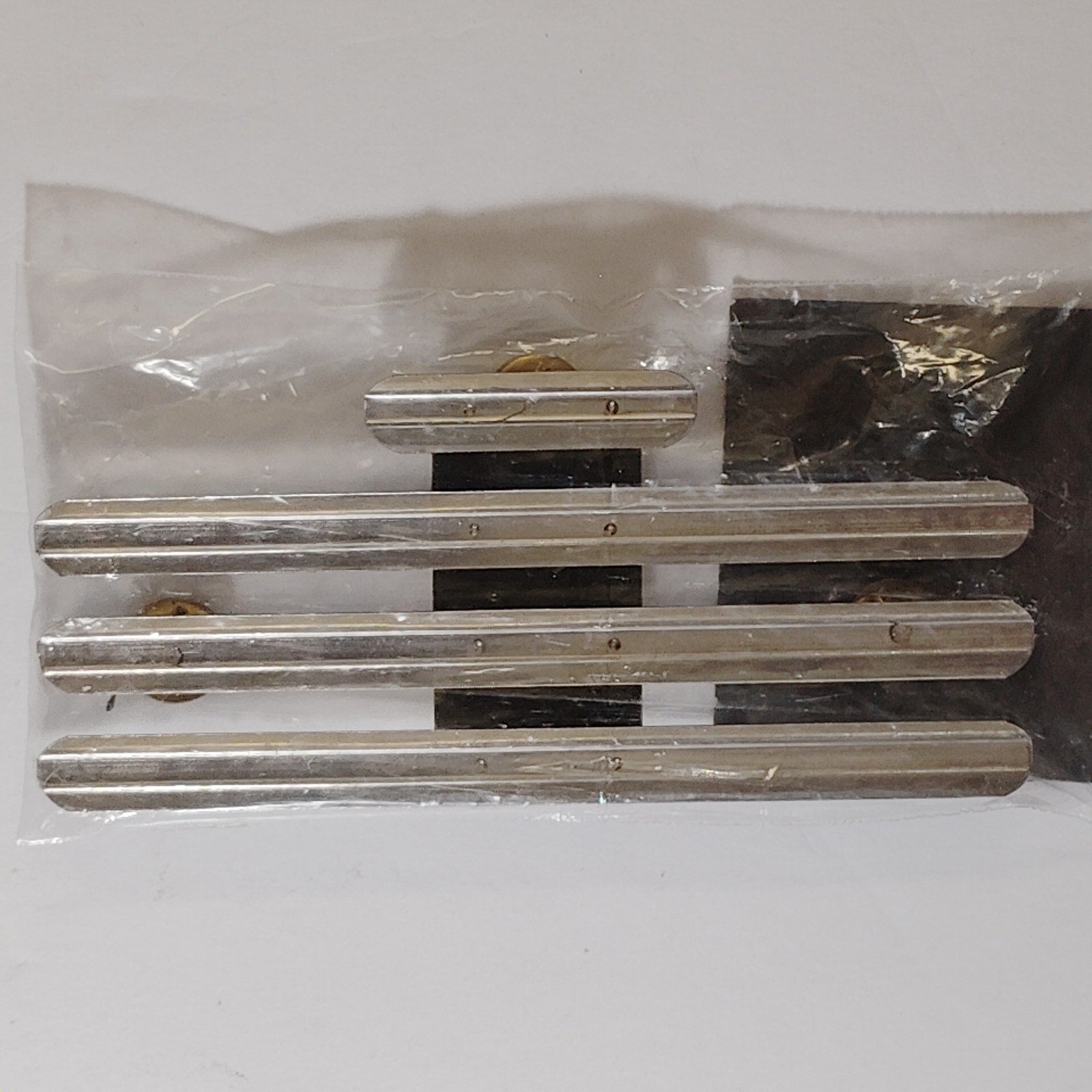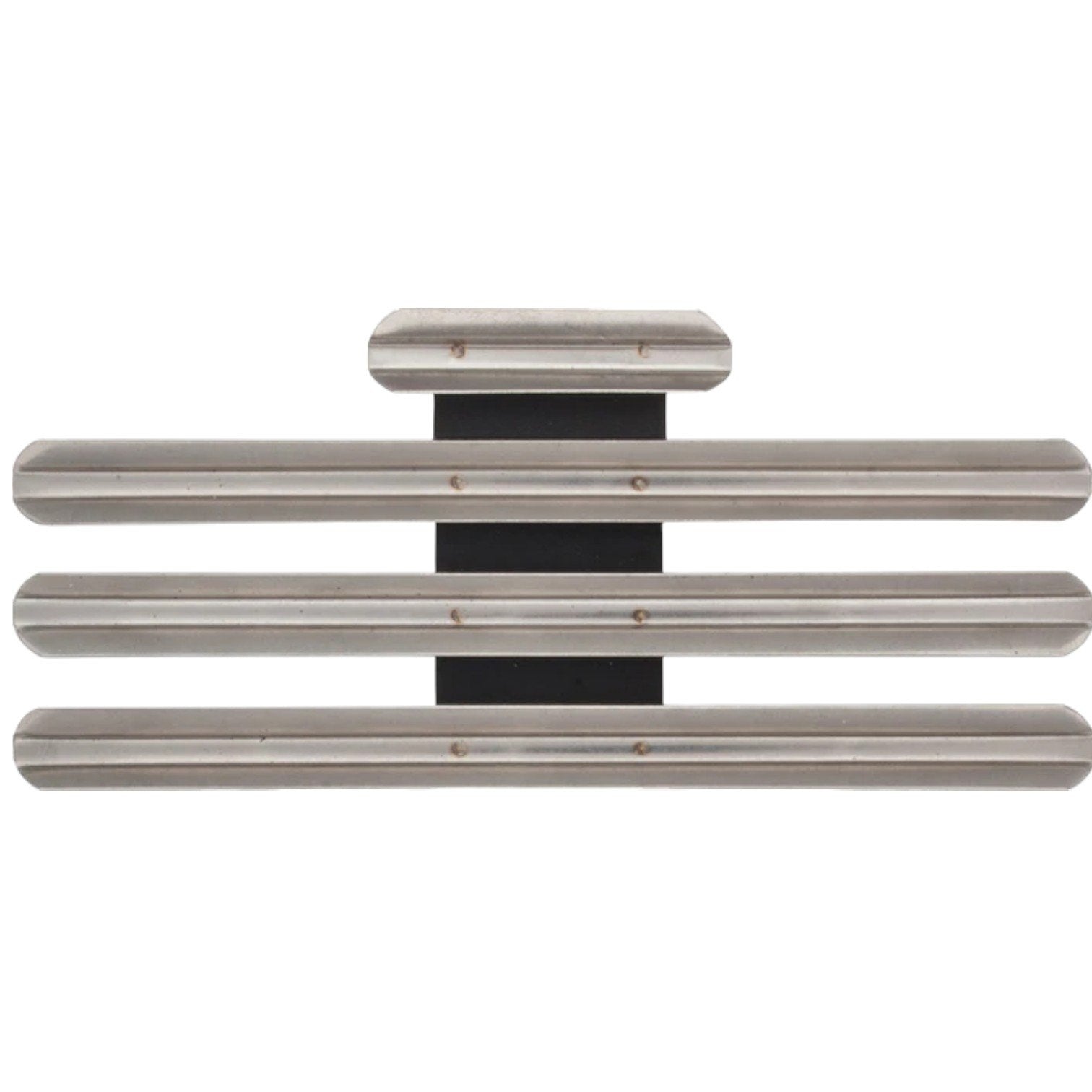 Silver metal rack bar holds 10 military ribbons in a four-row centered layout (3/3/3/1) with uniform 1/8" vertical gaps for structured display. Designed for dress uniform presentation with flush stacking and top-centered alignment. Made by No-Shine Insignia, formerly distributed by The Supply Room. Matte, non-reflective finish suitable for ceremonial wear. Includes clutch backs. Compatible with standard U.S. ribbon sizes and layout standards. Ideal for compact rack configurations with centered top-row precedence. Material: silver-tone anodized metal. Condition: new. Origin: USA. Government spec compliant.