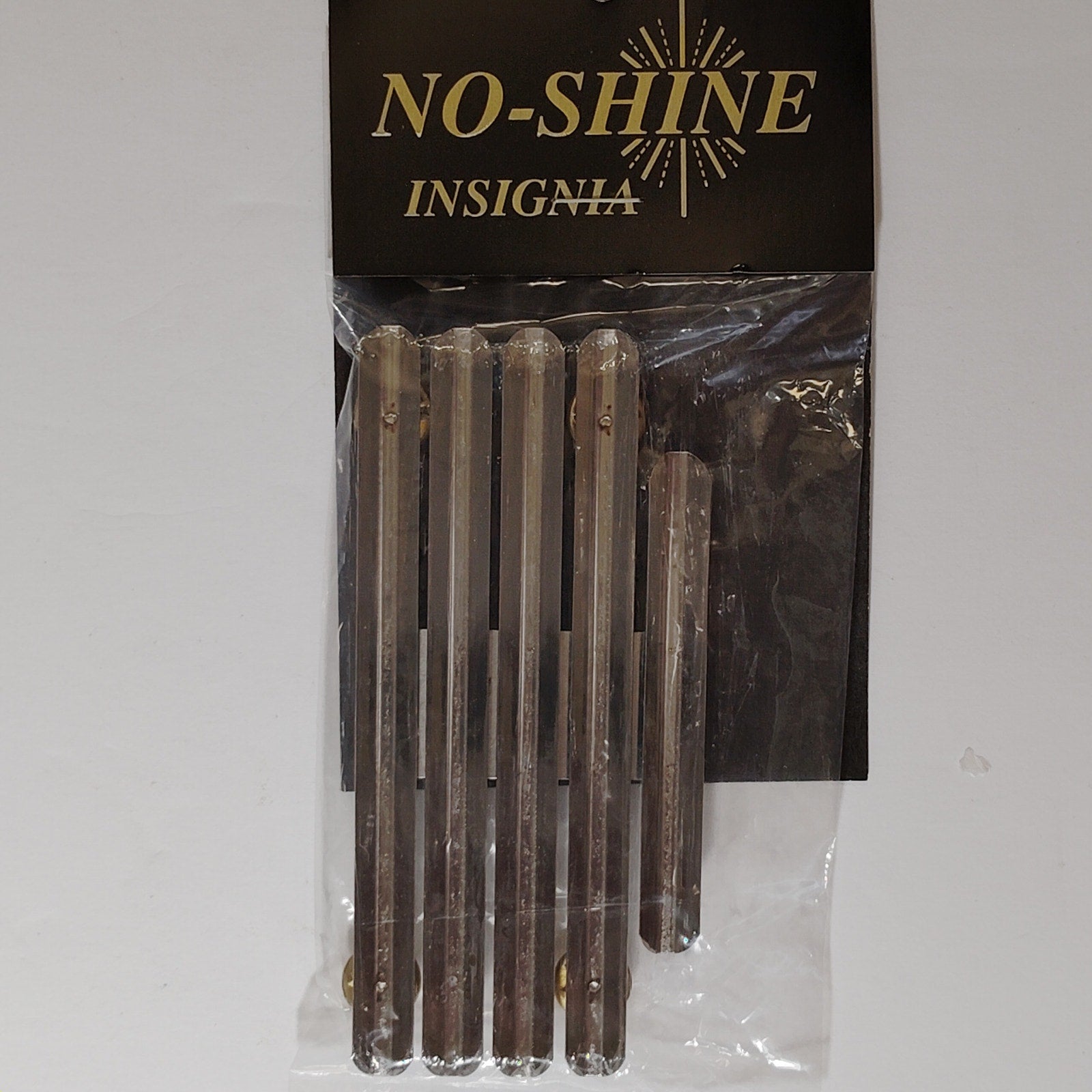 Silver metal rack bar holds 14 military ribbons in a centered five-row layout (3/3/3/3/2) with no vertical gap between rows for compact, flush presentation. Designed for dress uniform display with balanced alignment and top-centered row structure. Made by No-Shine Insignia, formerly distributed by The Supply Room. Matte, non-reflective finish suitable for ceremonial wear. Includes clutch backs. Compatible with standard U.S. ribbon sizes and layout standards. Ideal for mid-capacity uniform mounting with centered top-row precedence. Material: silver-tone anodized metal. Condition: new. Origin: USA. Government spec compliant.