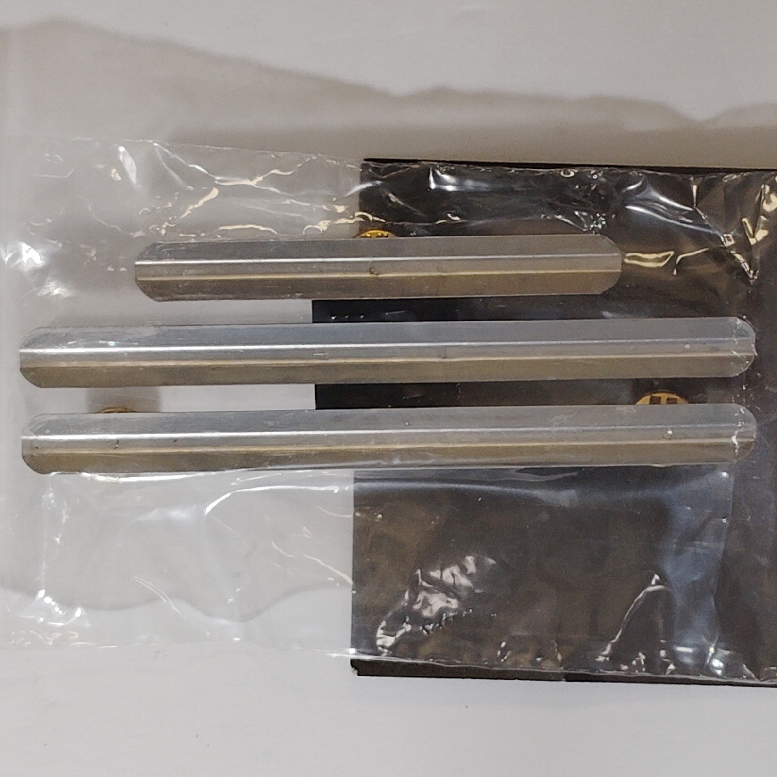 Silver metal mounting rack bar designed to hold 8 military ribbons in a 3/3/2 configuration, with the top row centered and a vertical gap between rows for enhanced visibility and separation. Manufactured under the No-Shine Insignia brand, previously distributed by The Supply Room. Features a polished, non-reflective silver finish suitable for dress uniform wear. Includes clutch backs for secure attachment. Compatible with standard U.S. military ribbon sizes and follows official precedence layout standards.