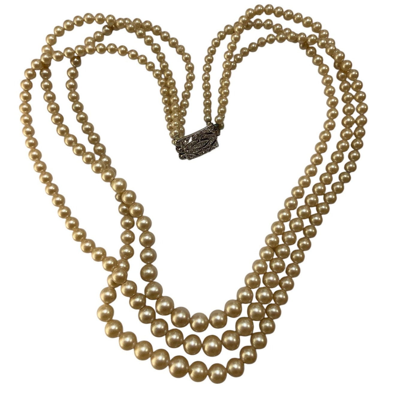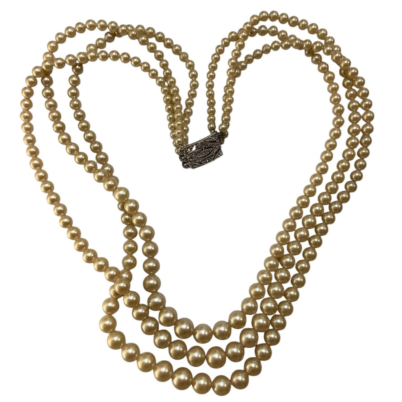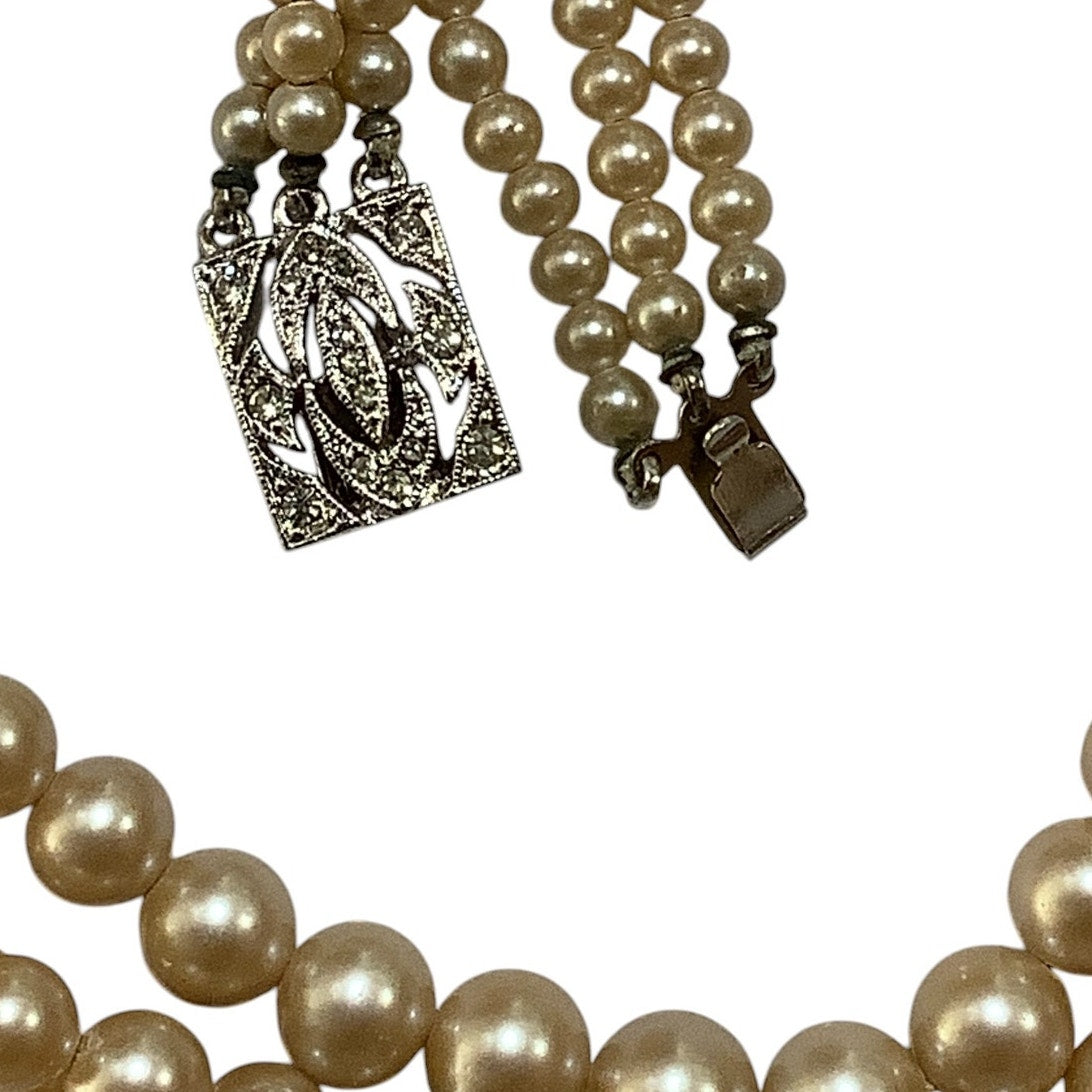 Multi-Layer/Strand Pearl w/ Silver-Tone Rhinestone Filigree Clasp 18.5" Necklace