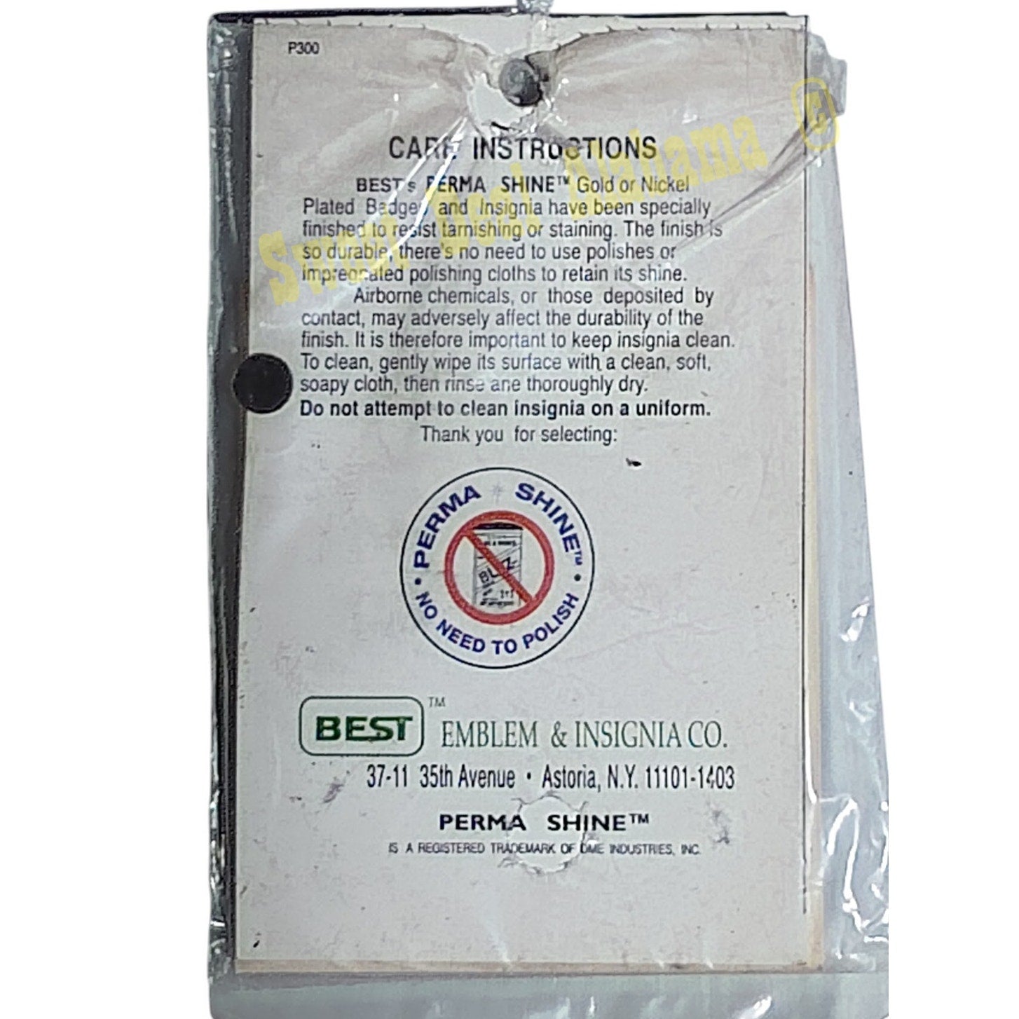 The Navy Officers Deep Submergence Insignia Badge Pin is a bright gold emblem measuring 1-7/16 inches in width by 3/4 inch in height. This badge is awarded to officers who are qualified in submarines and have completed at least one year of assignment to a manned or unmanned deep submersible. The design features the broadside of a Trieste submersible, flanked by heraldic dolphins and a vertical trident, symbolizing expertise in deep-sea operations.