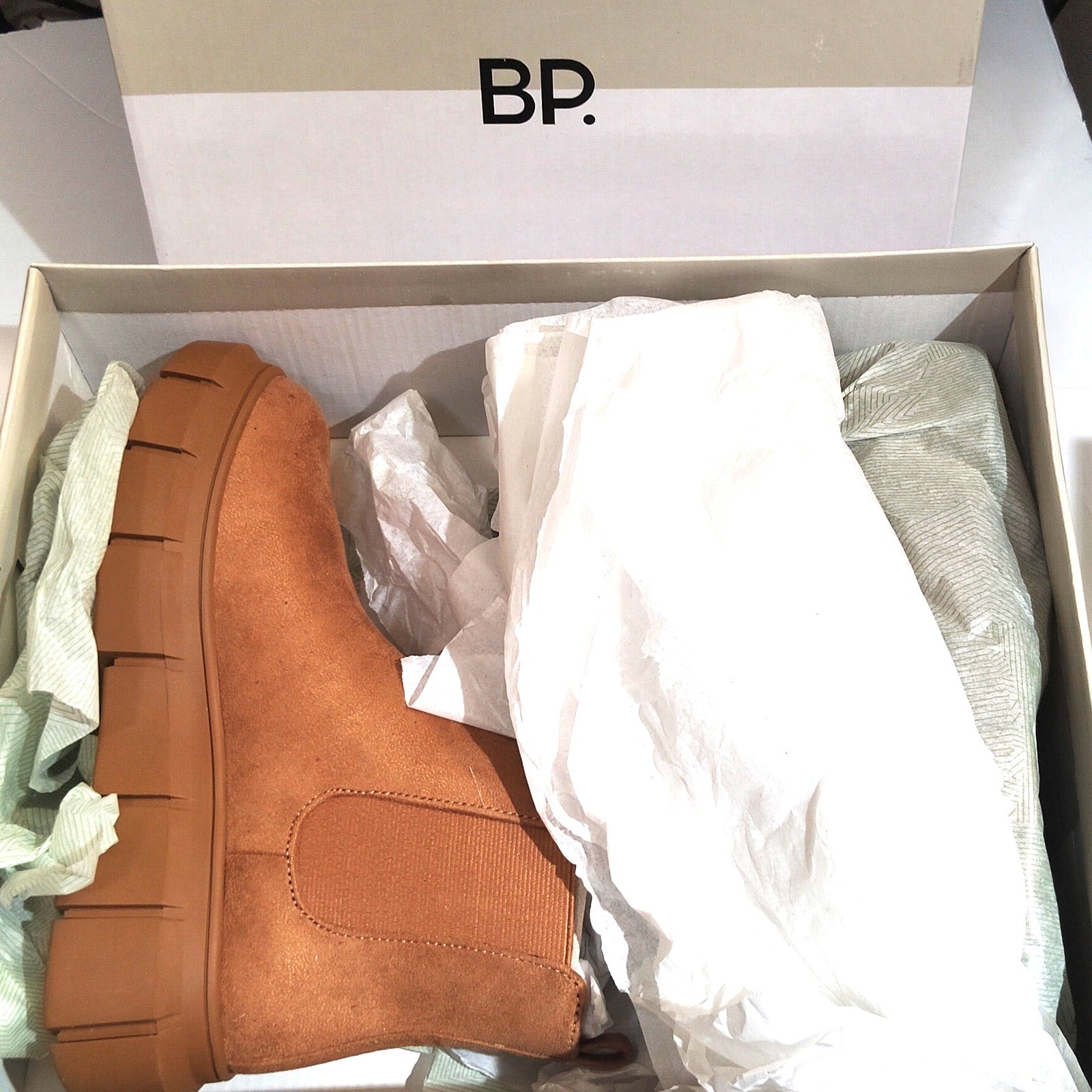 The BP. Niya Lug Sole Chelsea Boot in Tan delivers a modern update to the classic Chelsea silhouette with its chunky lug outsole and smooth suede‑style upper. Elastic side panels and a rear pull tab allow easy slip‑on wear, while the rugged sole provides traction and a contemporary streetwear look. This Nordstrom‑carried style pairs well with denim, leggings, and fall/winter layering. New and unused.