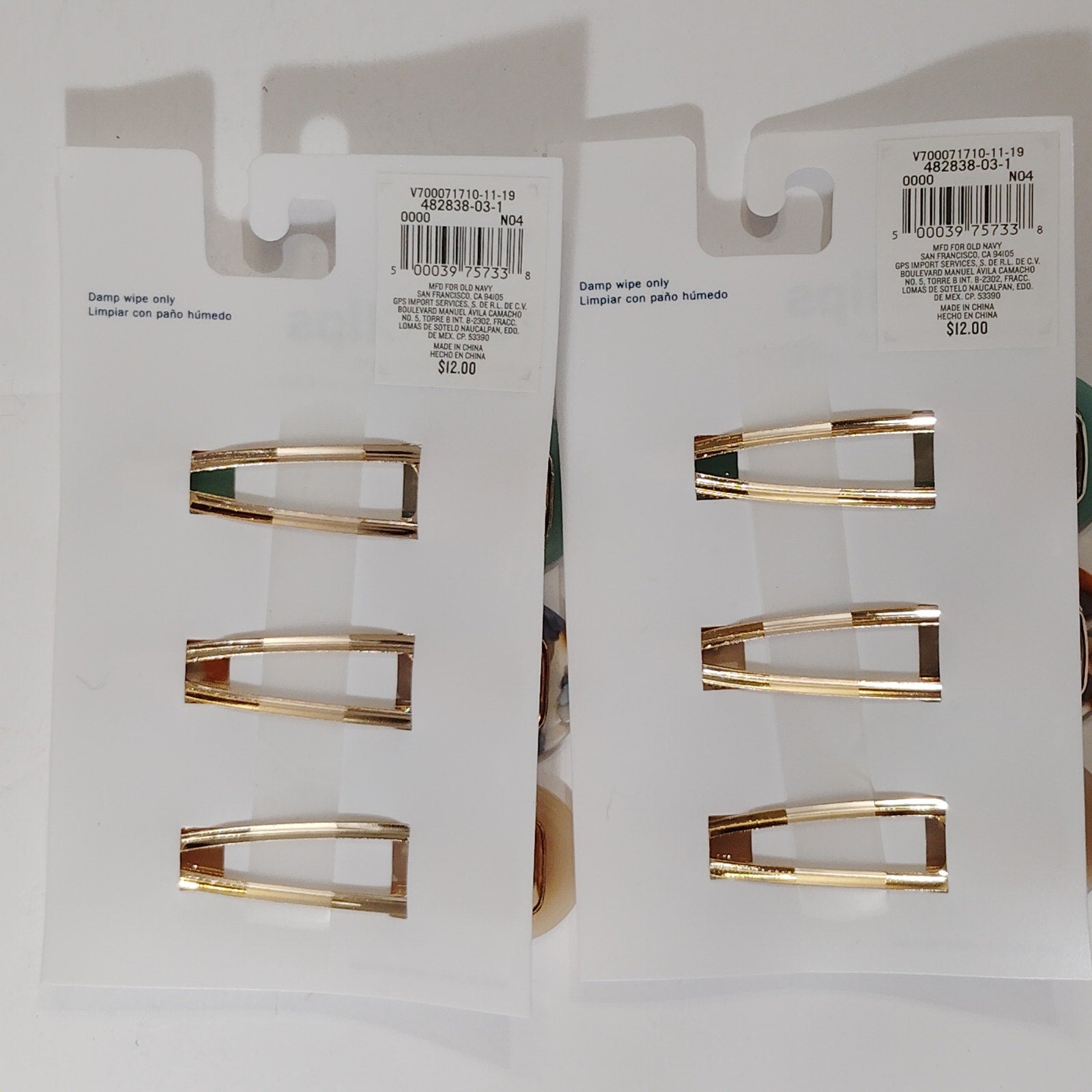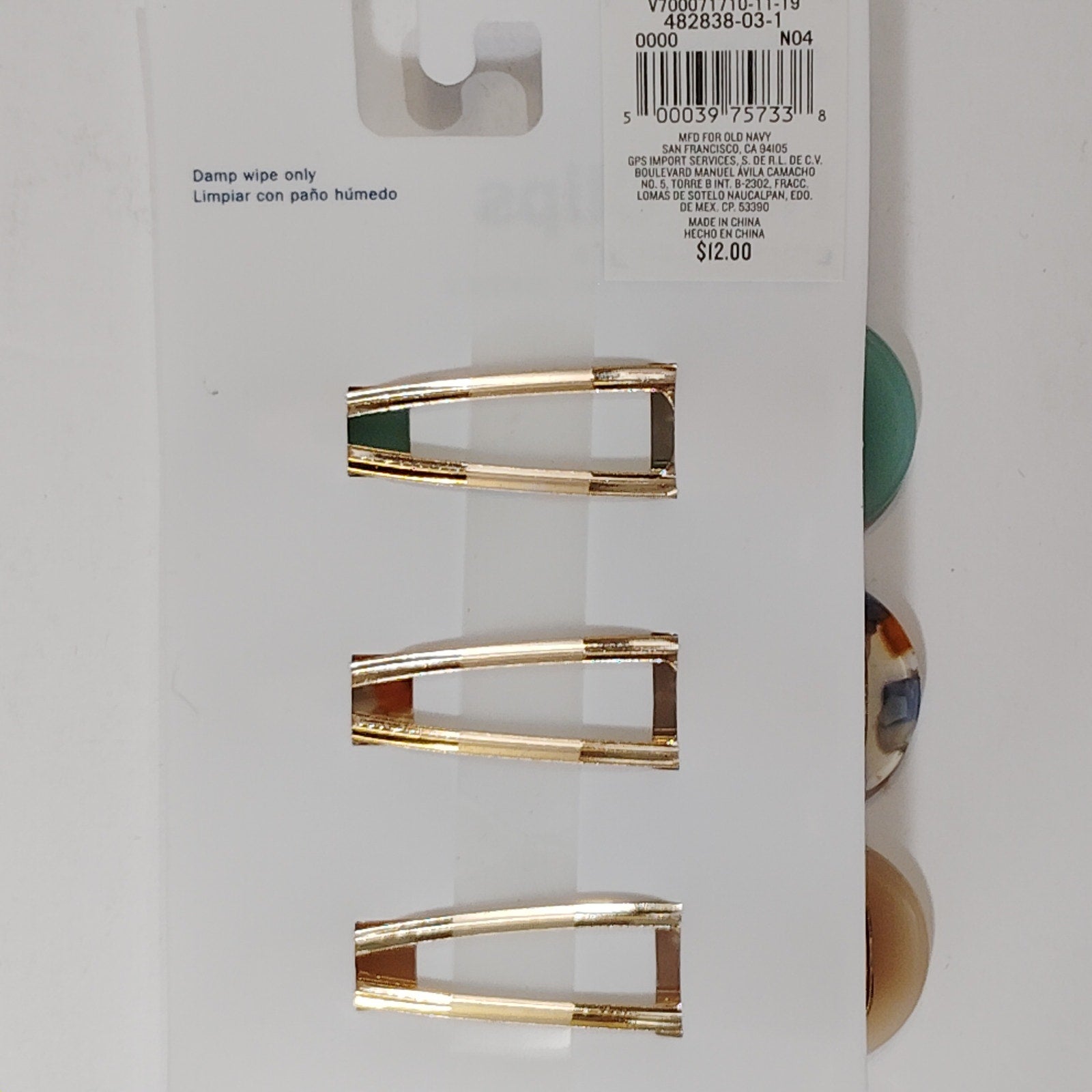 Set of 2 matching 3-packs of Old Navy Hair Clips, each featuring a stylish teardrop shape with gold-tone metal clasps. Every card includes one solid mint green, one beige marble-look clip, and one clear confetti clip embedded with orange, blue, and white accents. Designed for ages 5 and up, these clips offer a secure hold and versatile styling for everyday wear.
