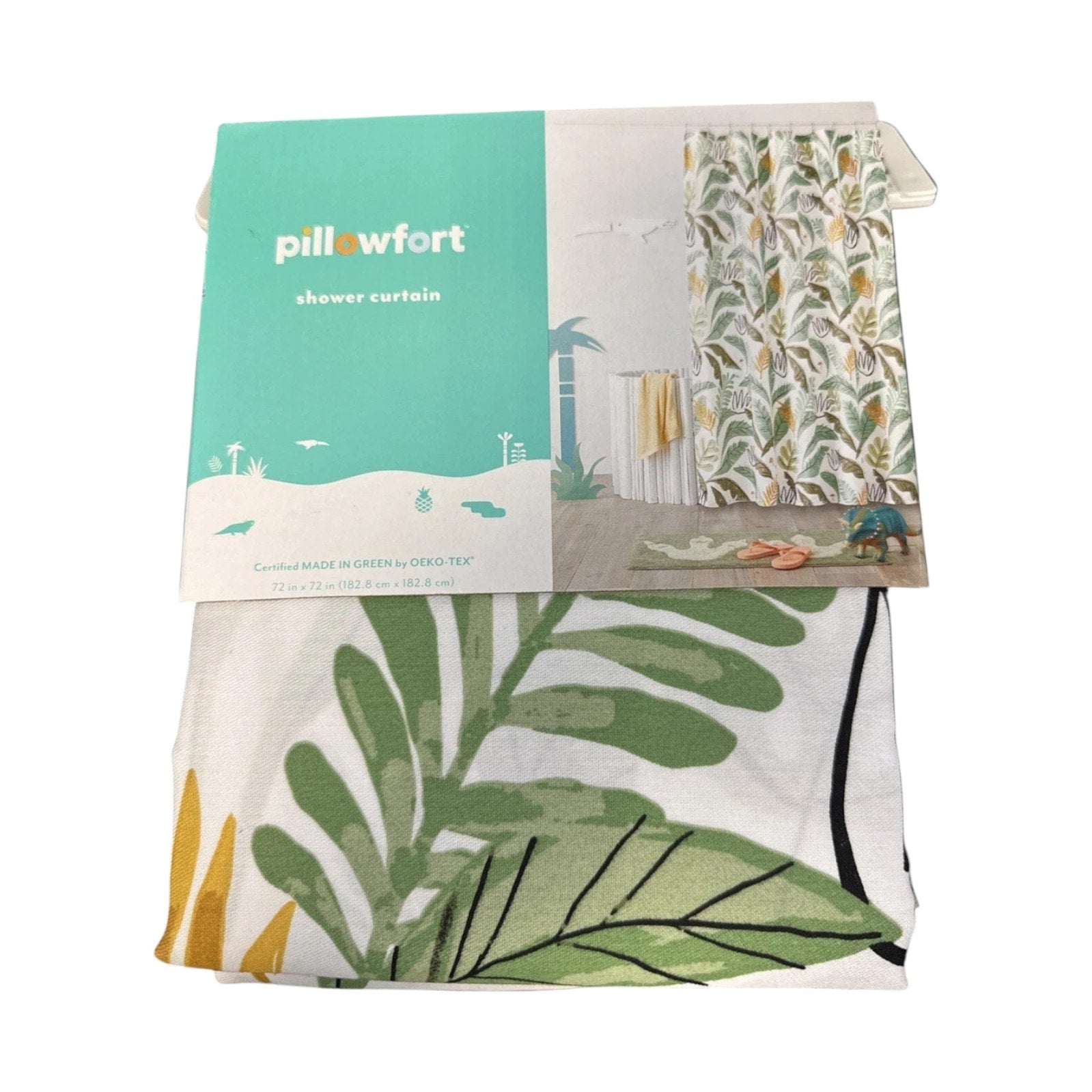 Pillowfort botanical-themed kids’ shower curtain in soft twill fabric. Features a playful nature-inspired print with buttonhole top for easy hanging. Made from recycled polyester for eco-conscious households. Sized at 72 inches by 72 inches to fit standard tubs. UPC: 191908984001.