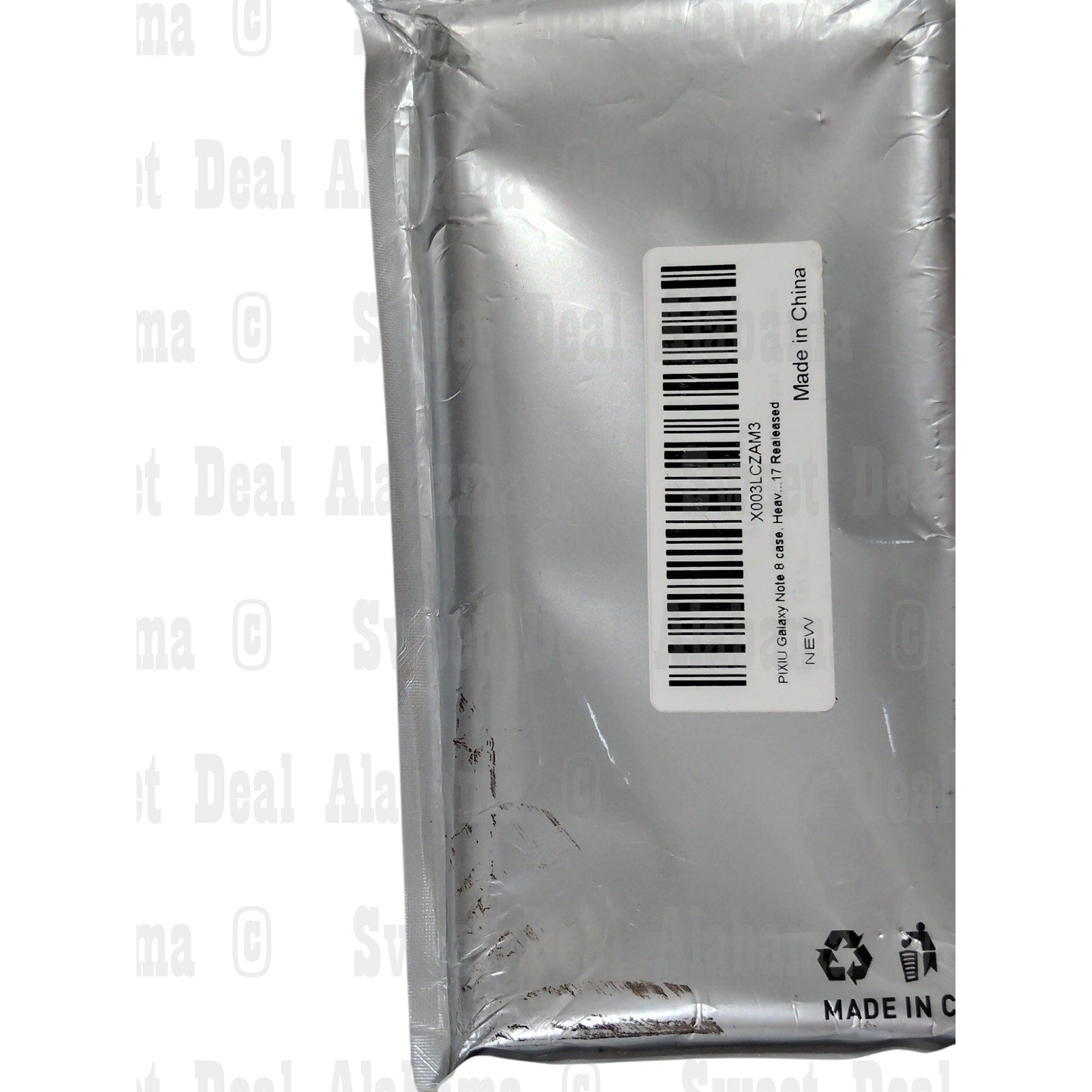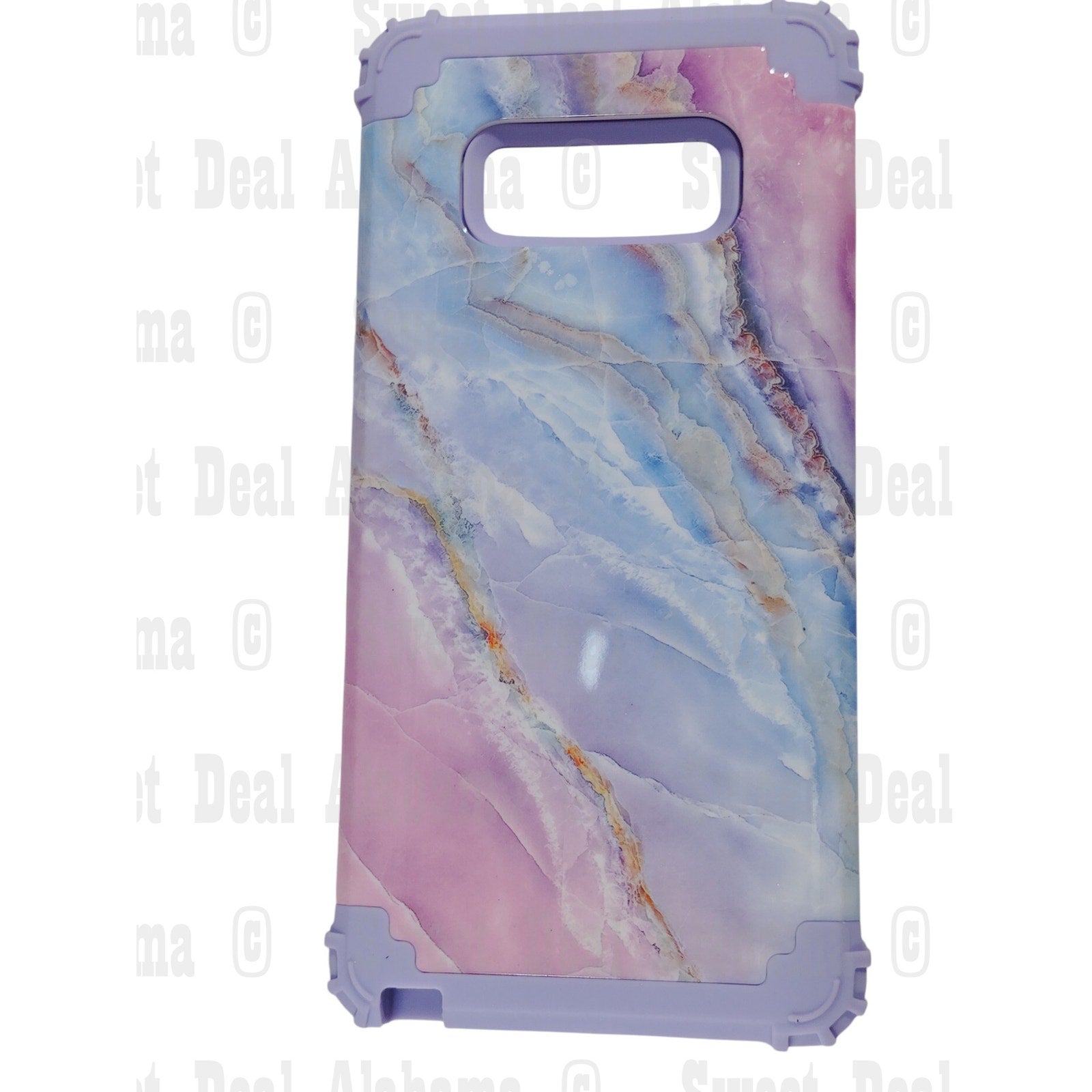 This Pixiu cellphone case for the Samsung Galaxy Note 8 features a marbled graphic design with a blend of blue, pink, and purple hues. The case has reinforced purple accents on the corners, providing extra protection while maintaining a stylish aesthetic.