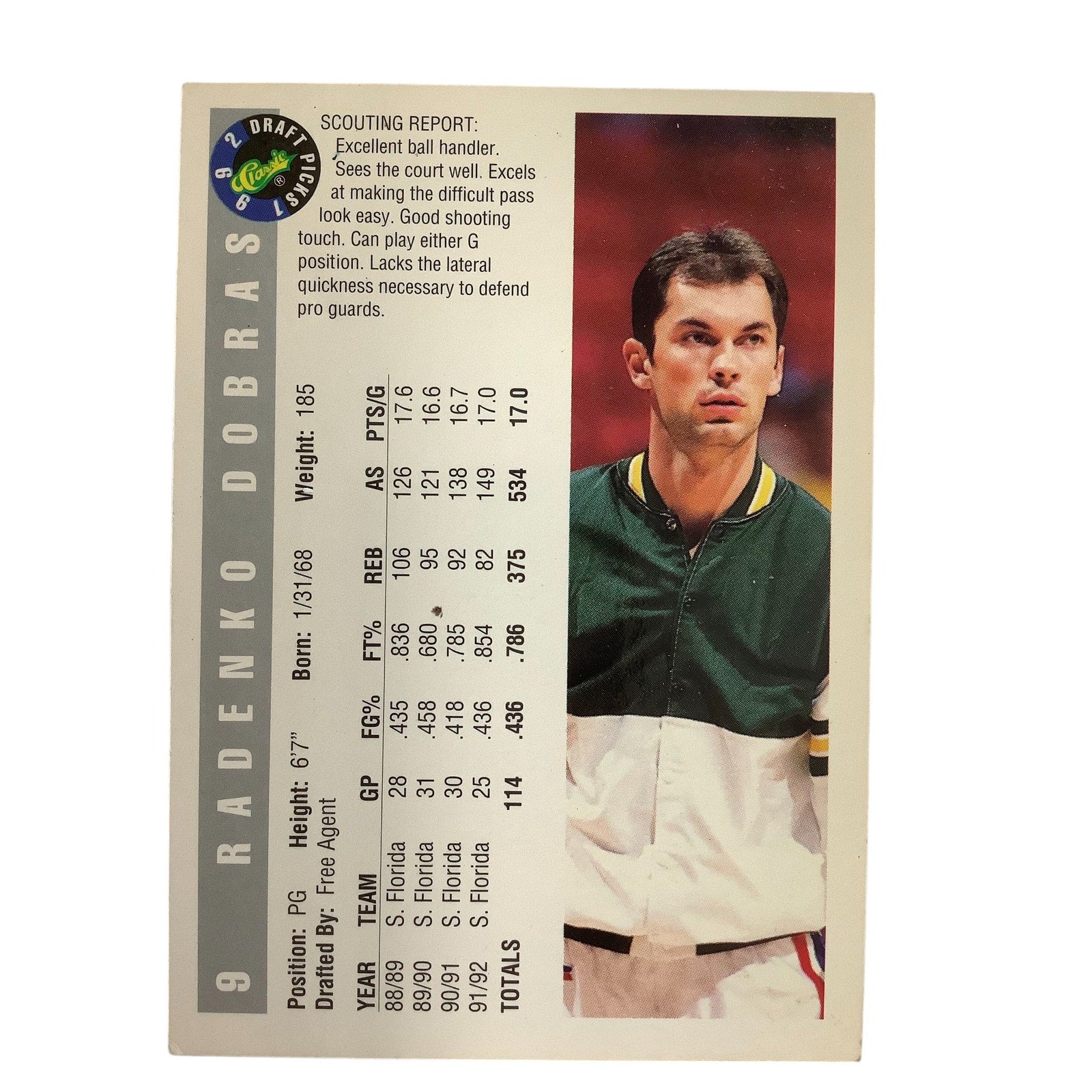 Radenko Dobras, University of South Florida (G), Classics 1992 Draft Picks EXC