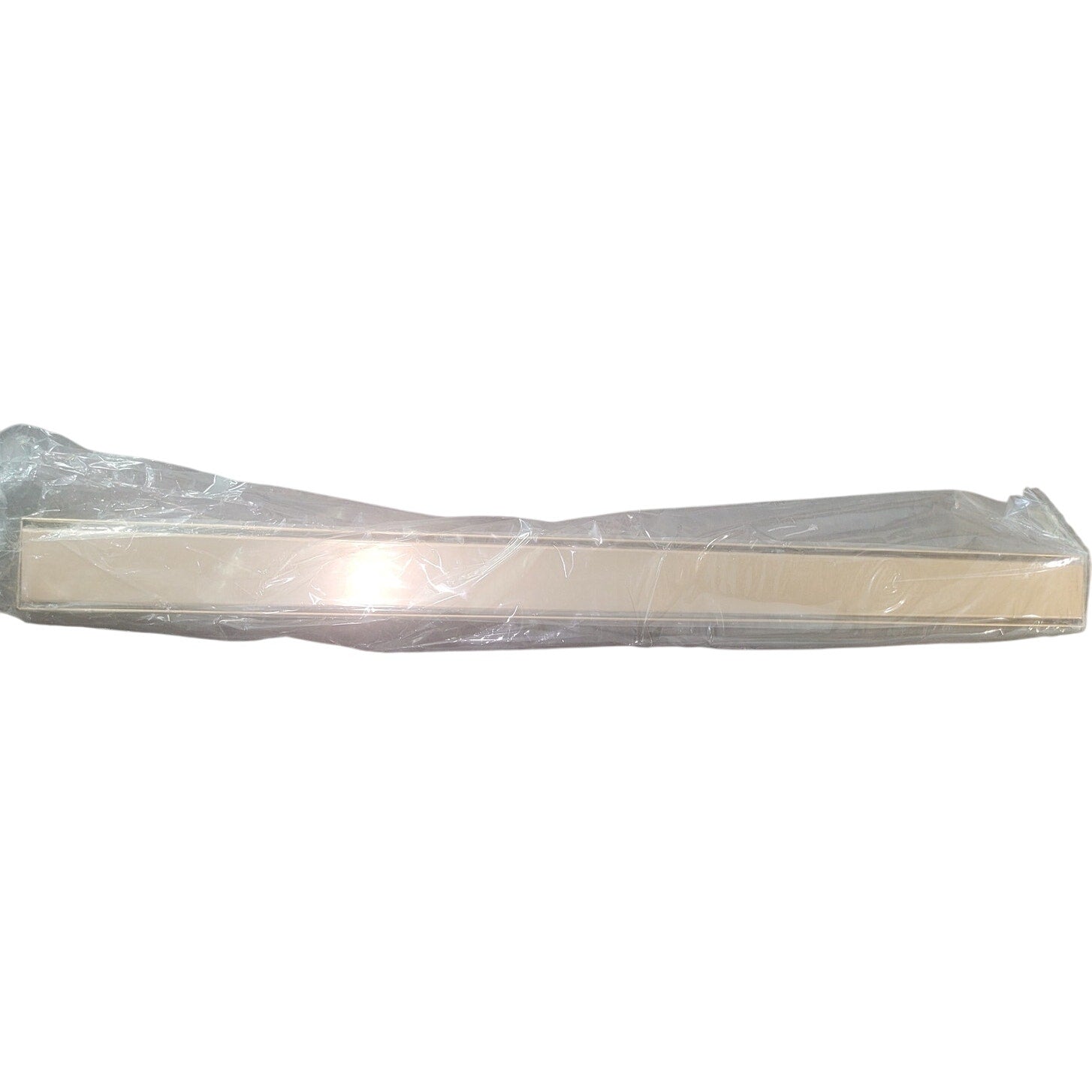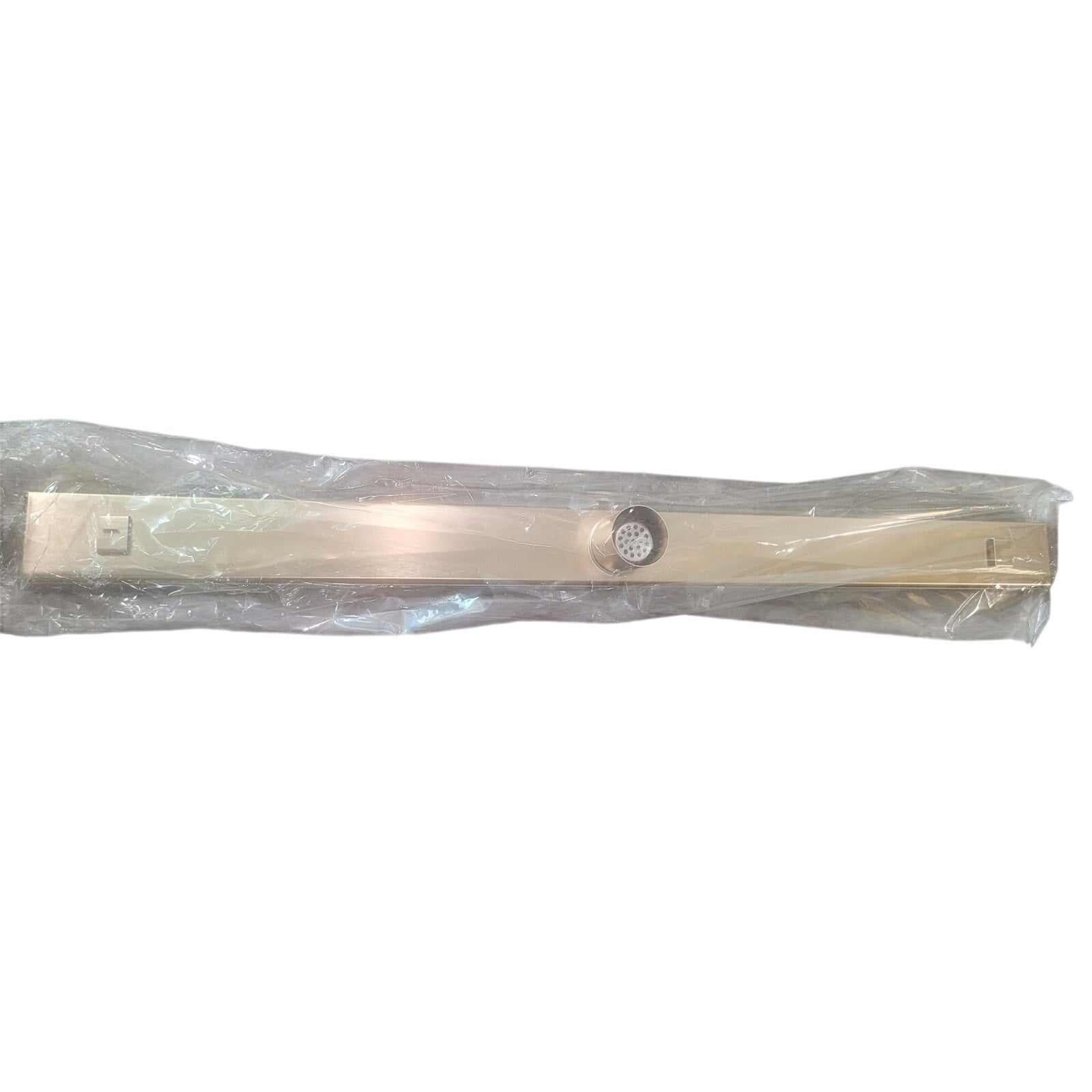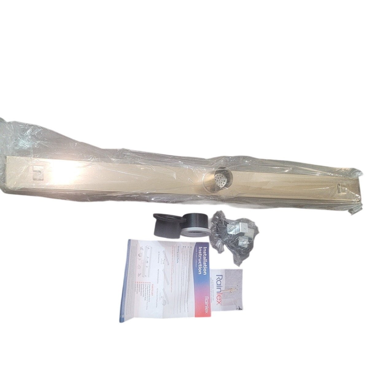 Rainlex RX7001LSJ-36 linear shower drain features a 36-inch brushed gold tile-in cover for seamless floor integration. Made from corrosion-resistant 304 stainless steel, it includes a shallow V-profile for high water displacement (42.5 L/min), a removable strainer basket, and adjustable feet for uneven surfaces. Designed for modern showers with large-format tile or mosaic flooring. Includes lifting hook and threaded adapter joints with rubber seals. Drain flange sold separately (SKU RX7000). UPC 782003878816.
