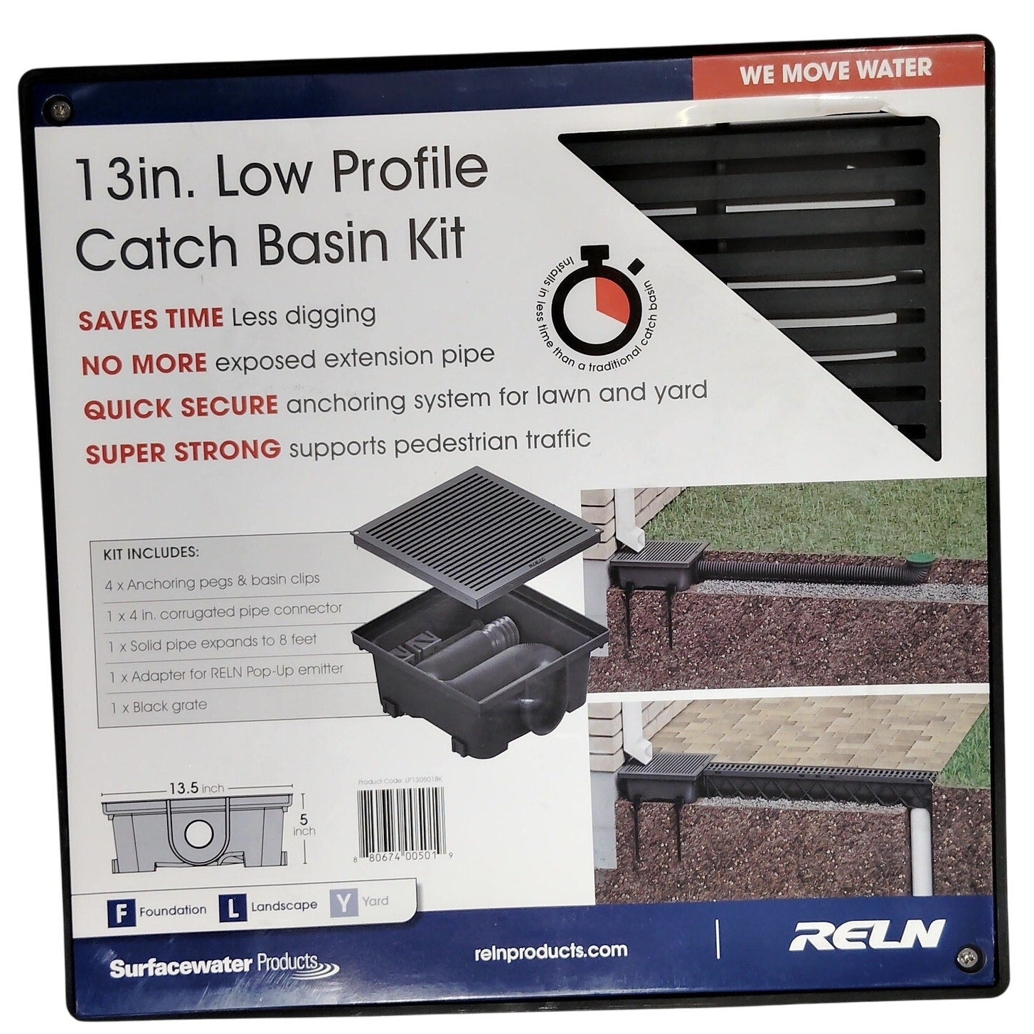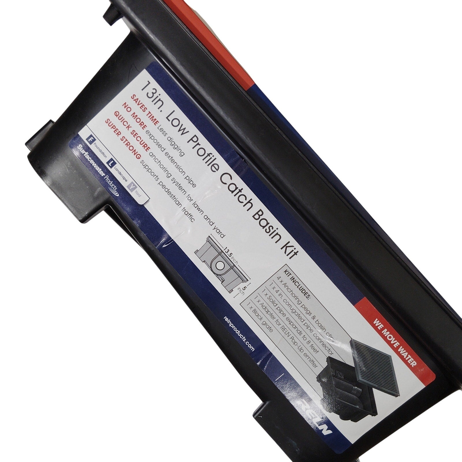 The RELN Low Profile Catch Basin Kit features a compact 13" × 5" square design ideal for shallow drainage applications in residential or commercial landscapes. Made from durable black plastic, it includes a removable grate for easy debris access and water flow management. Perfect for patios, driveways, and garden areas where full-depth basins aren't feasible. Condition: New in package (NIP).