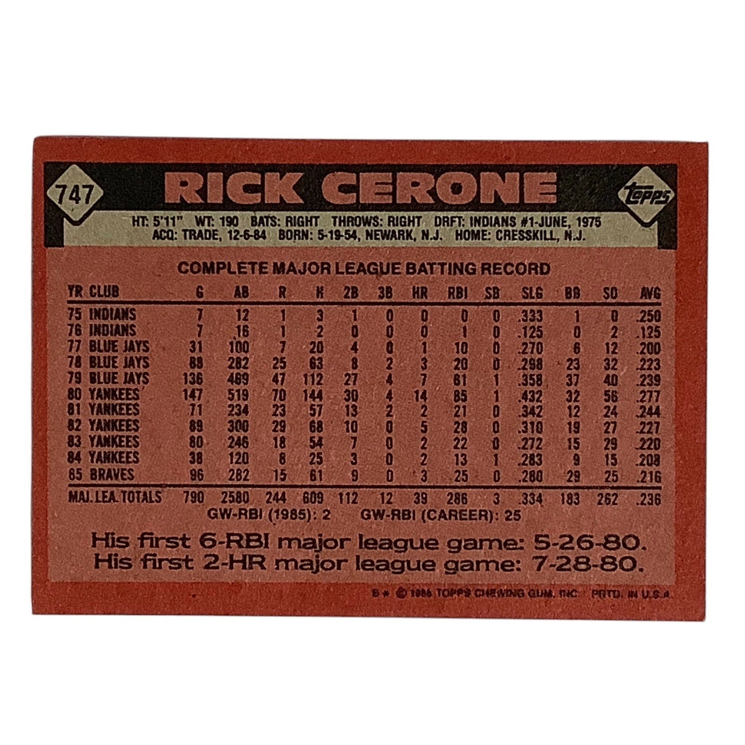 Rick Cerone, Atlanta Braves, MLB, Topps 1986, Card 747, EX/NM