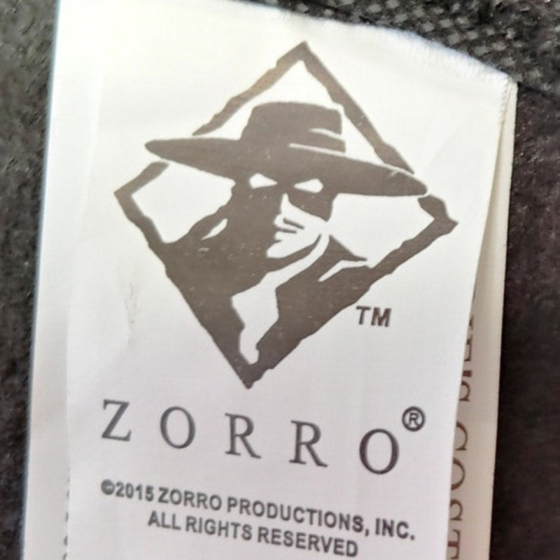 Officially licensed Zorro costume accessory hat for adults. Molded felt construction with short crown and wide brim, accented by antique-style gold lace trim. Includes adjustable black chin cord. Designed to complete Zorro-themed costumes with dramatic flair.