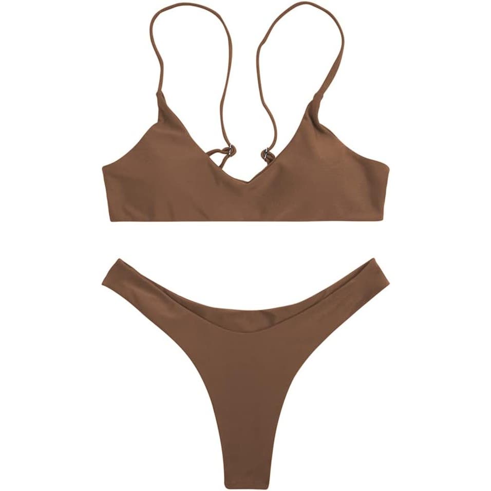 SherryDC Solid Scoop Neck Push up Padded Brazilian Thong Bikini, Brown, L