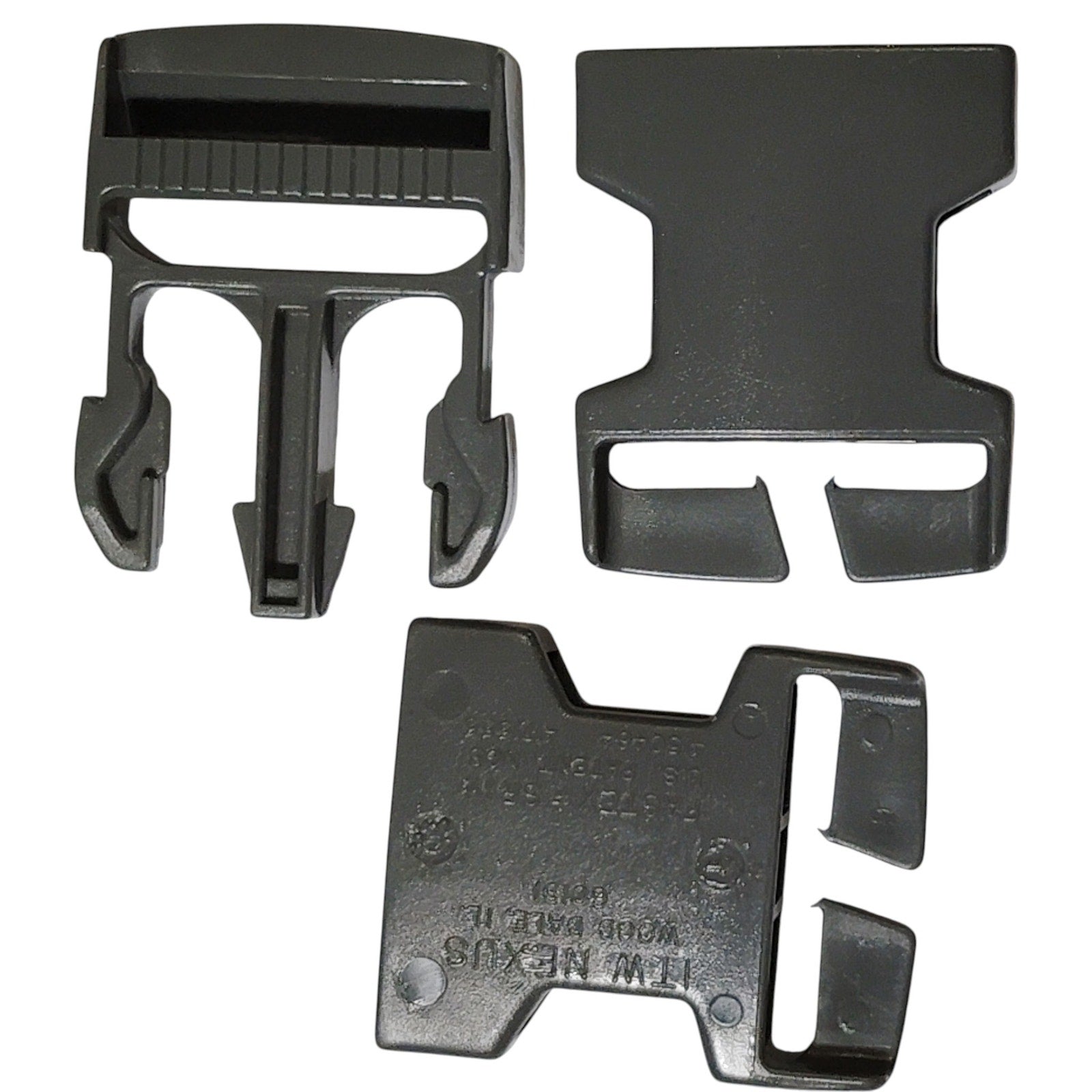 Genuine ITW Nexus side-release buckle set in 1½" size, made from high-strength Gray polymer. Includes one complete buckle (male + female ends) plus one additional female end for backup or dual mounting applications. Designed for use with 1½" webbing, this buckle features the patented ITW Nexus quick-release mechanism, known for durability and secure fastening in tactical, outdoor, and load-bearing gear. Ideal for repairs, gear customization, or surplus builds. Made in the USA.