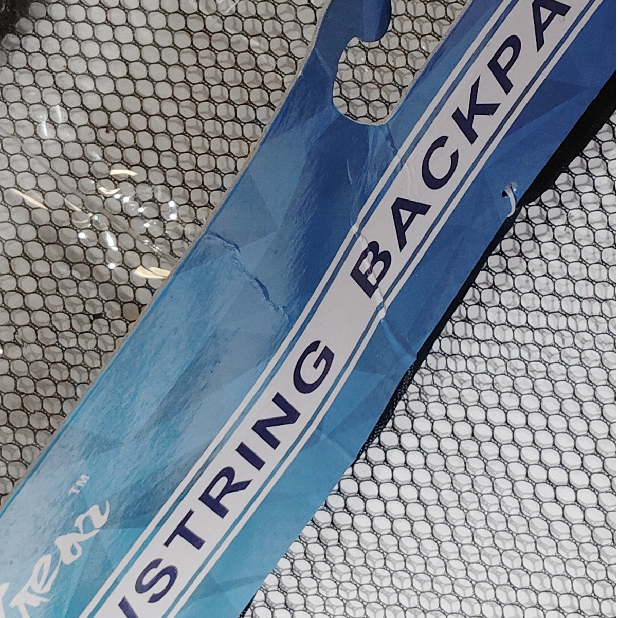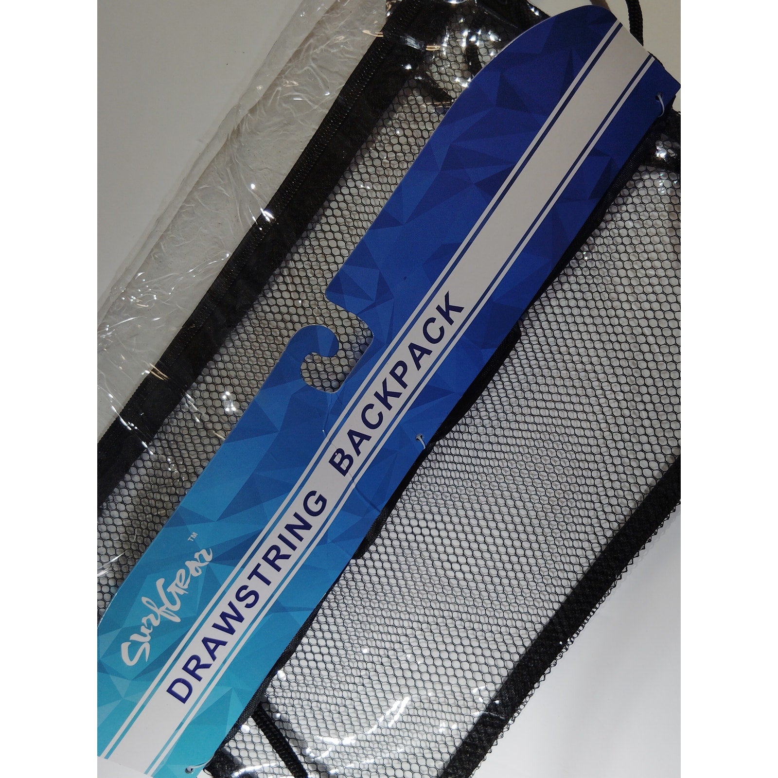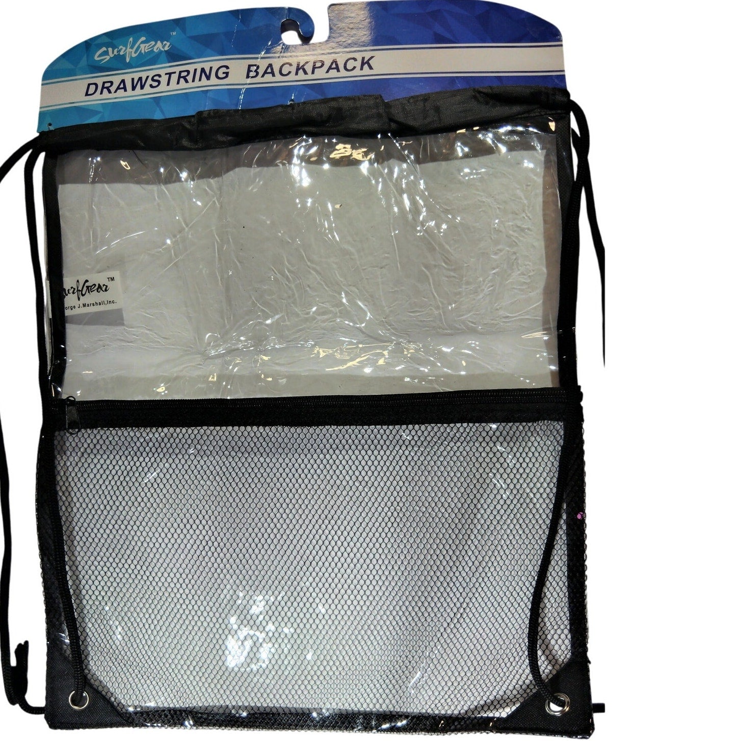 SurfGear clear drawstring backpack made from transparent PVC, stadium approved for quick security checks. Features a zippered mesh outer pouch for added storage and organization. Lightweight and durable with black trim, ideal for concerts, sporting events, festivals, travel, and work. UPC 097529158435. Complies with most venue regulations for clear bags.